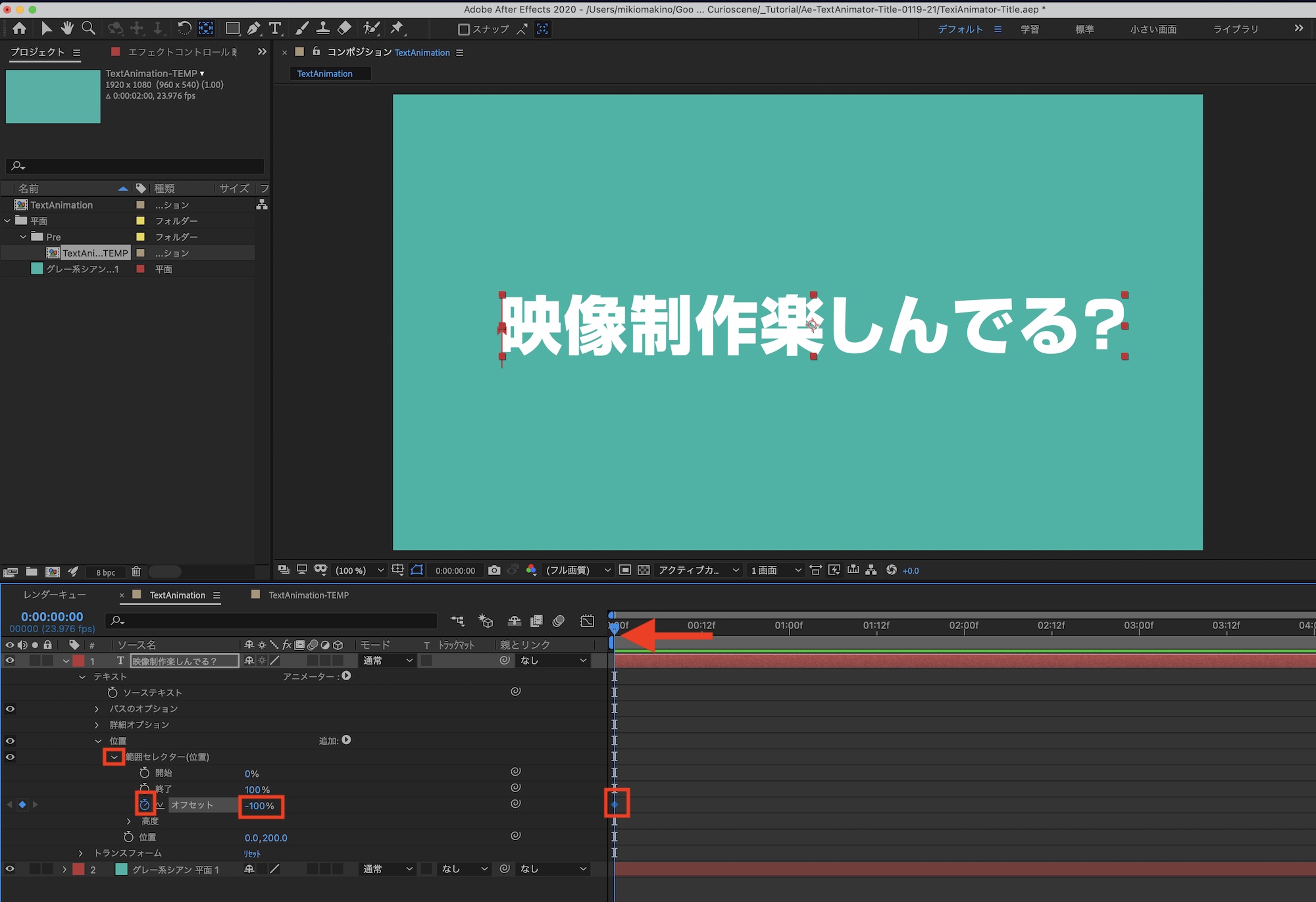 「範囲セレクター(位置)」の三角アイコンをクリックして展開し、タイムインジケーターを「0秒」に動かします。「オフセット」の数値を「-100%」にした後で、ストップウォッチアイコンをクリックしキーフレームを追加します。