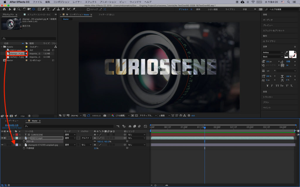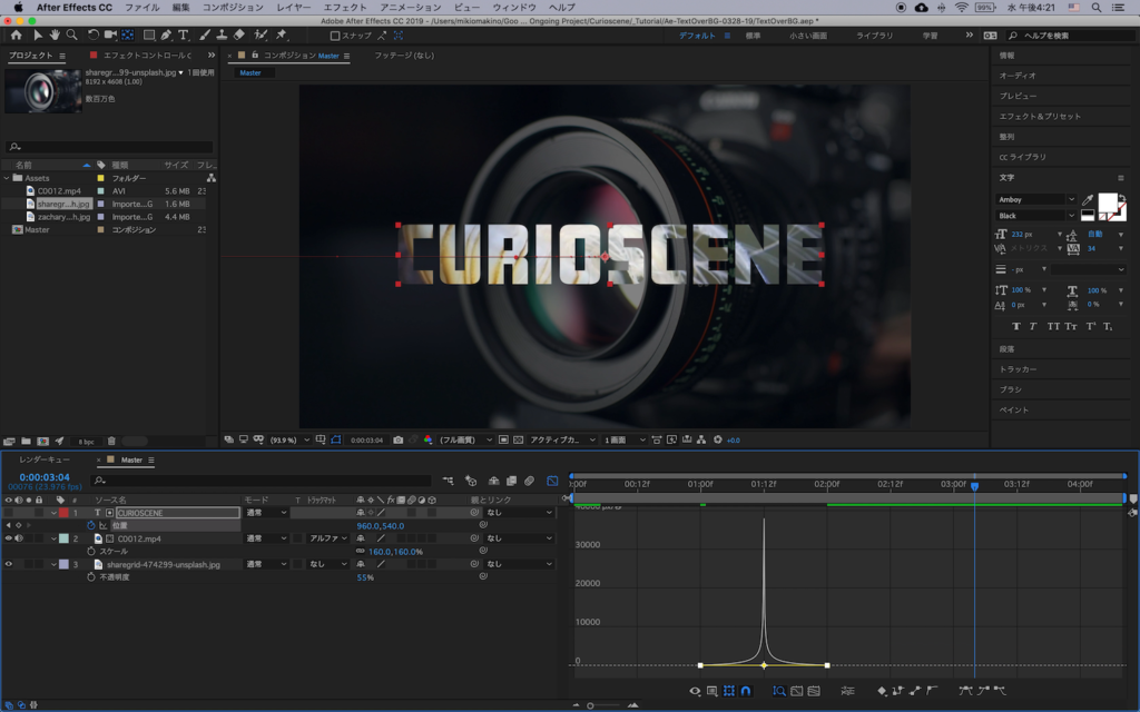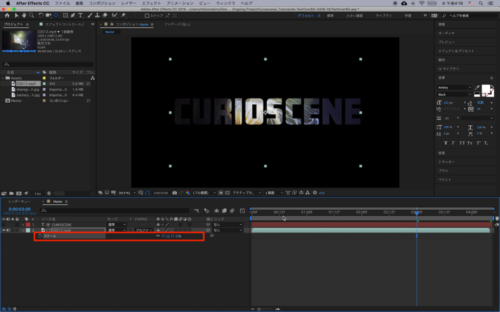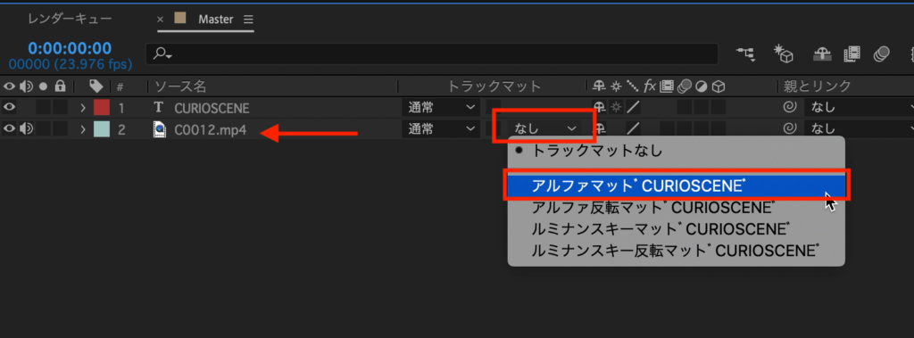 テキストの配置が完了したらクリップの「トラックマット」の項目から「アルファマット」を選択します。下の画像では「アルファマット’CURIOSCENE’」となっていますが、「’ ‘」の間にはトラックマットを適用するレイヤーの真上にあるレイヤー名が表示されます。
