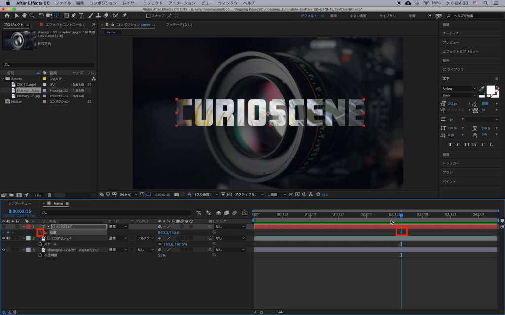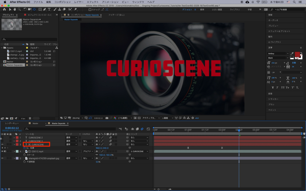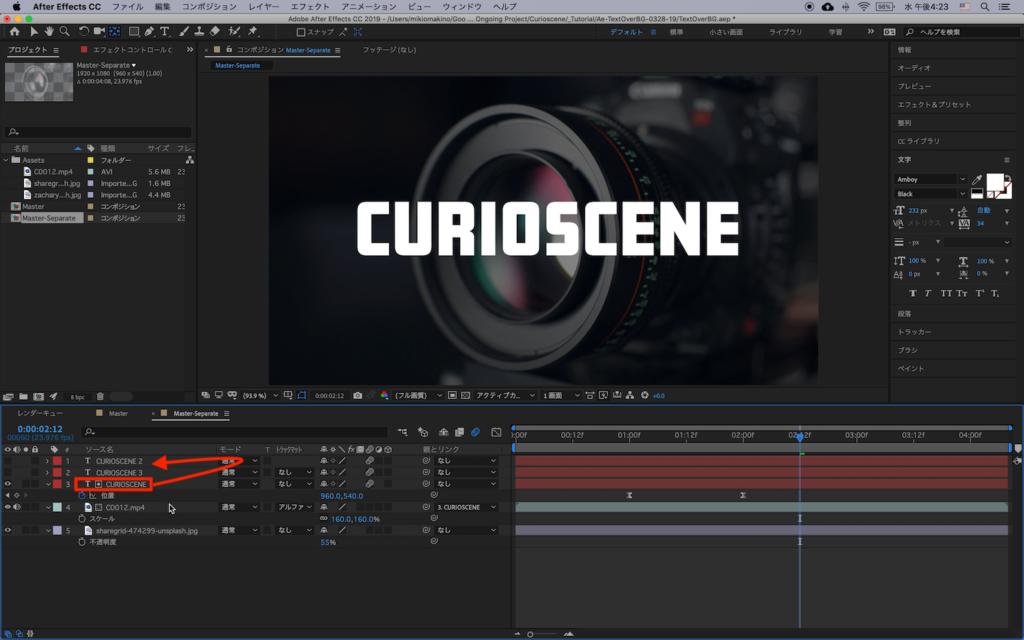 上で使用した「CURIOSCENE」を「CURIO」、「SCENE」にして、それぞれの単語に別のクリップを追加していきましょう。まずは「CURIOSCENE」のテキストを2回複製し、3つのテキストレイヤーを作成します。