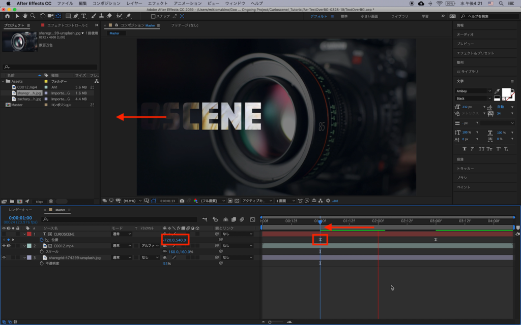 そしてタイムインディケーターを1秒程度戻して、位置のX軸の数値を変更するか、コンポジション上でテキストレイヤーを動かしてフレームの外に移動させます。