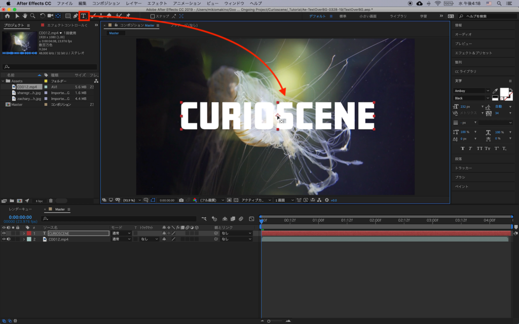 コンポジションに追加した後はツールバーからテキストツールを使用し、好きなテキストを追加していきましょう。合成の際にクリップなどが見えやすくなるように、太めのフォントを使用する事をオススメします。