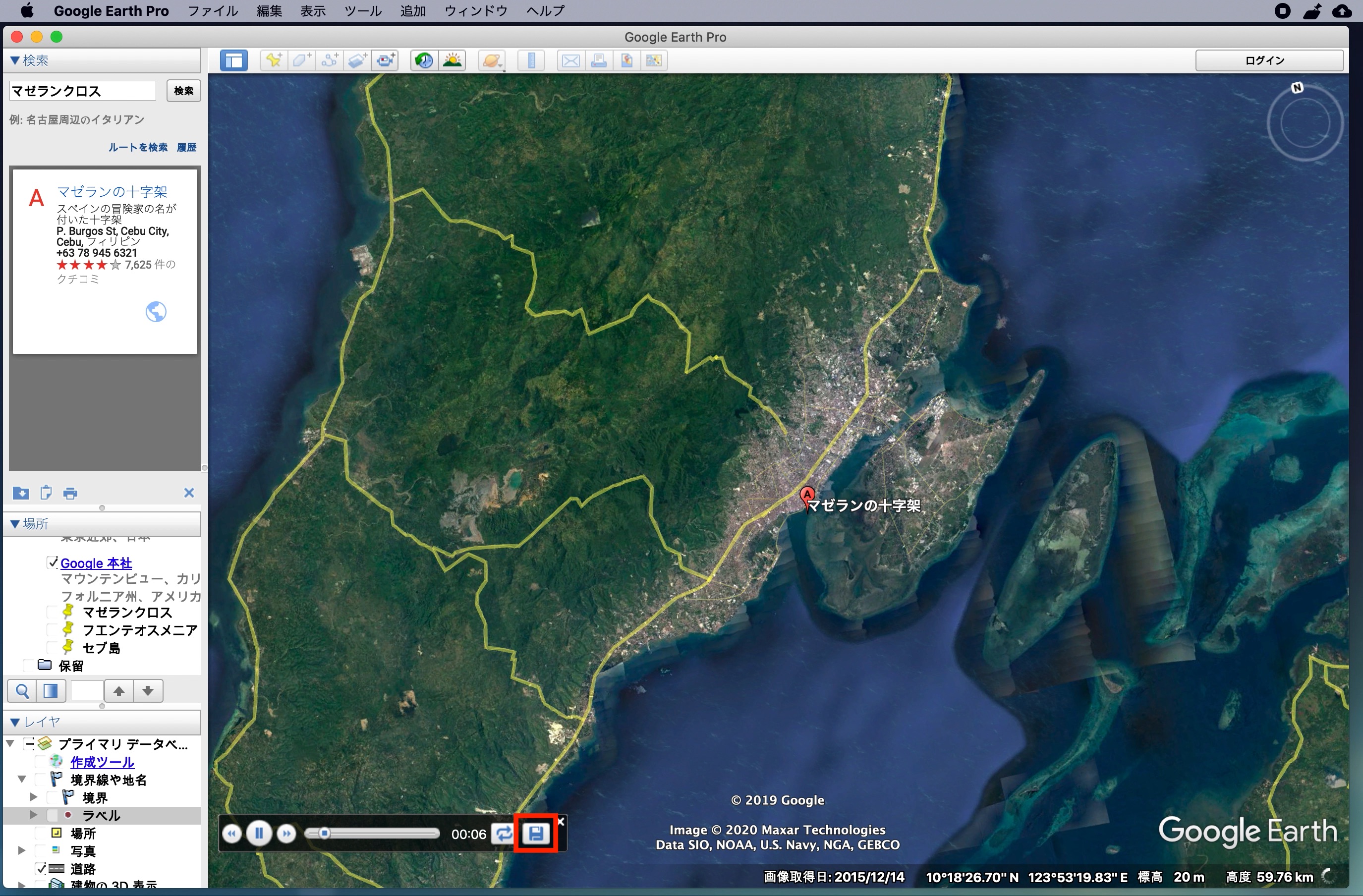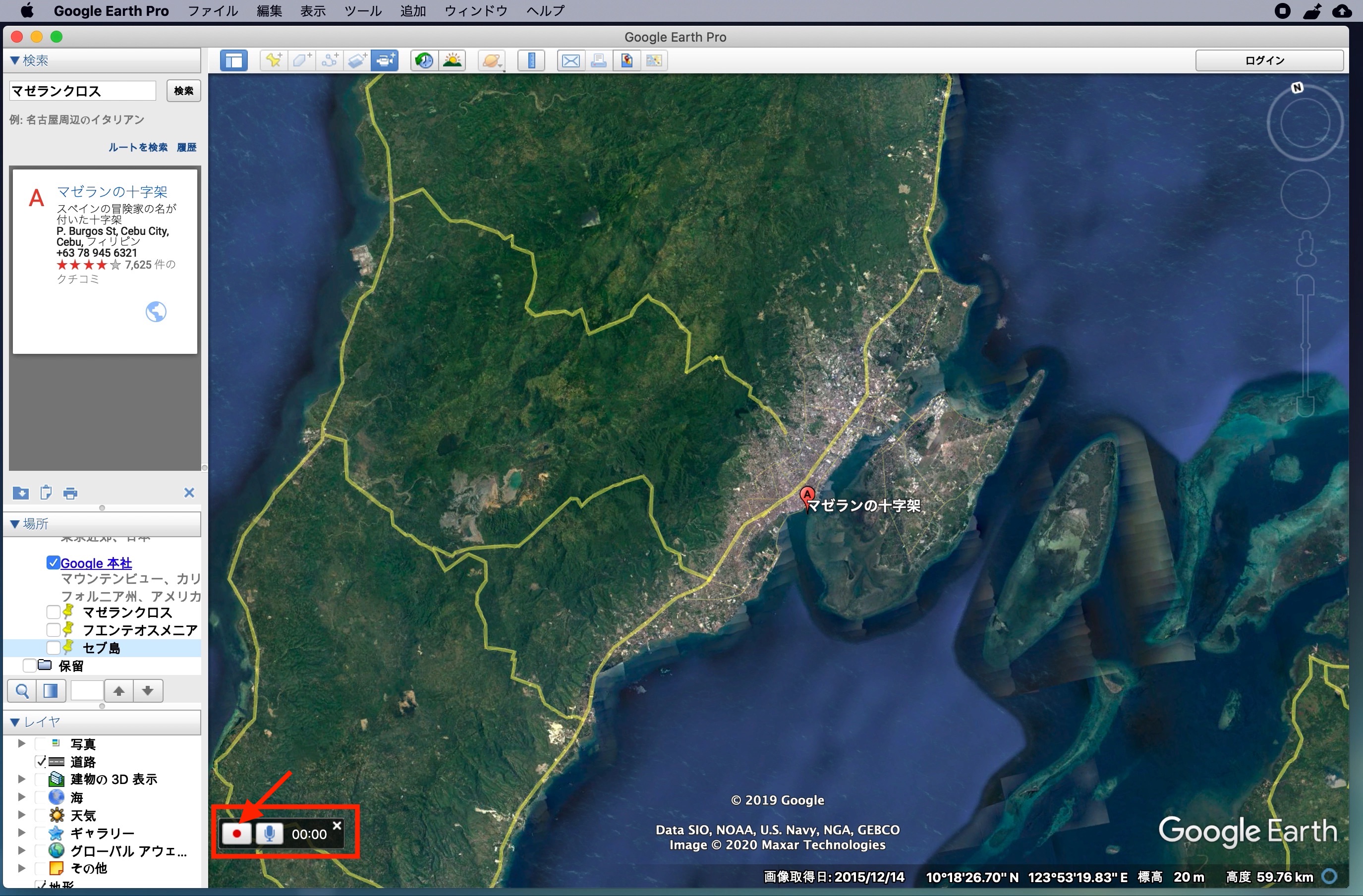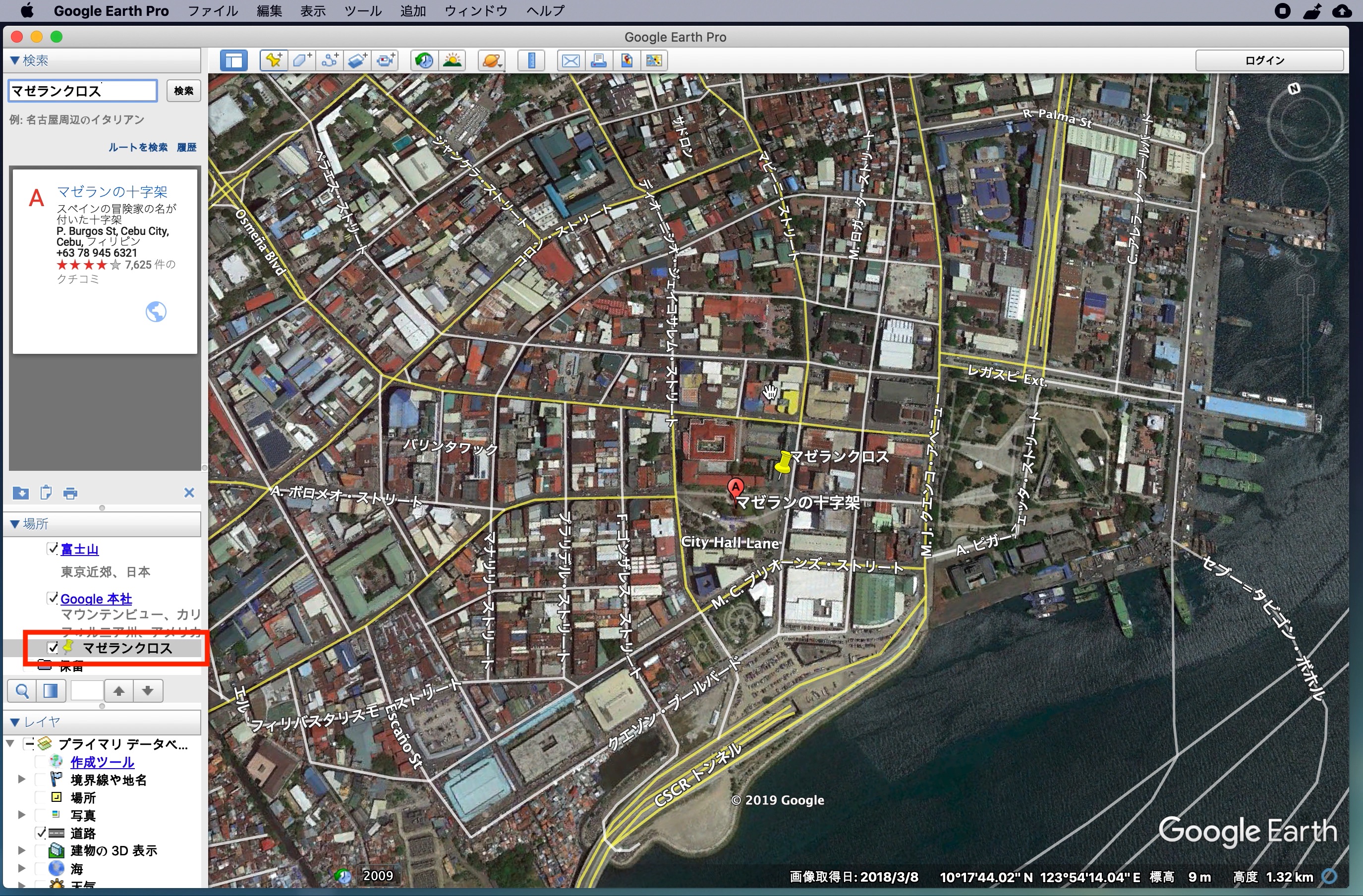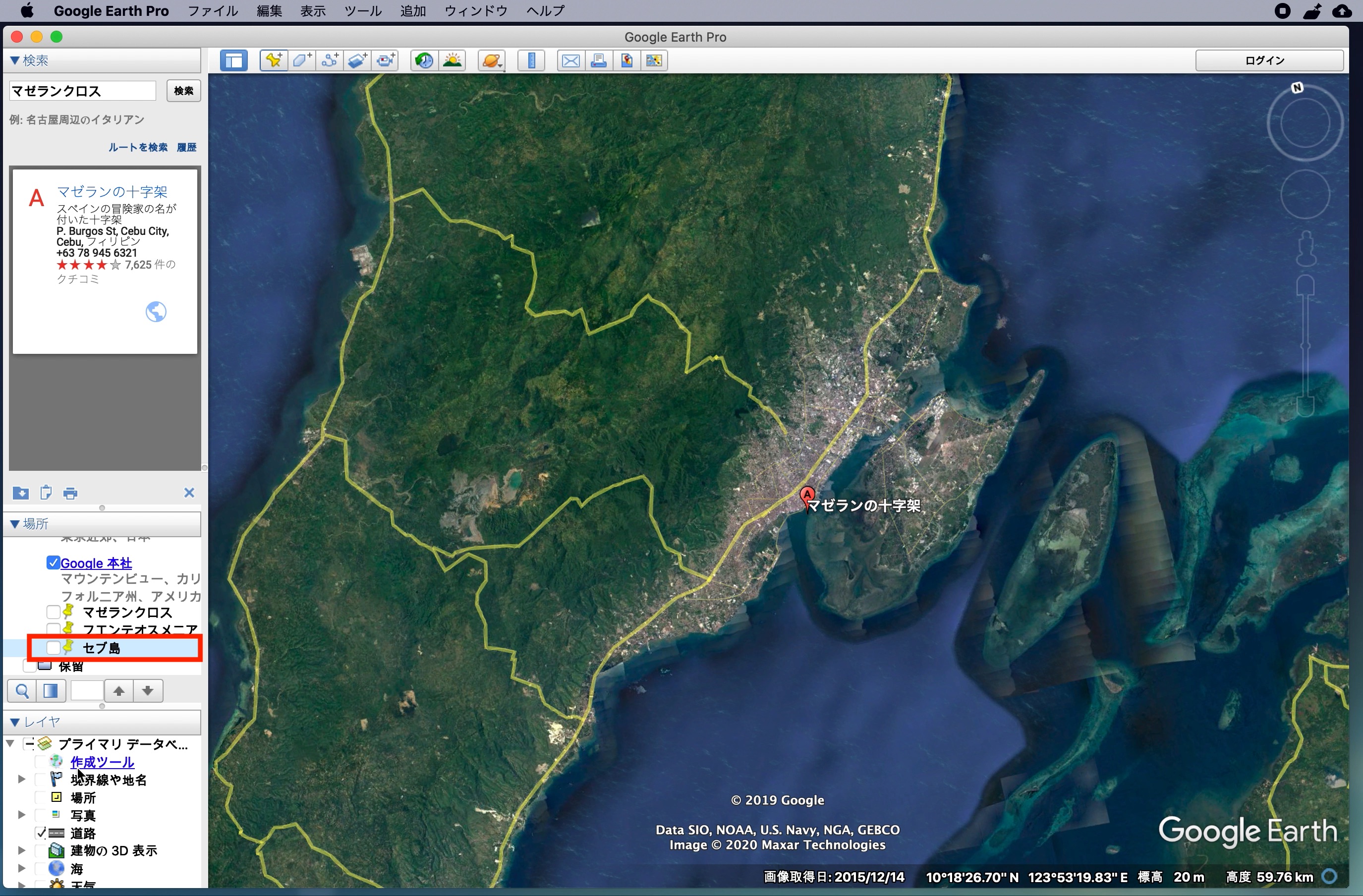 左上にある「検索」からGoogle Mapsと同じ感覚でロケーションを探すことができます。下の例ではセブ島の観光地の一つである「マゼランクロス」を探してみた例です。