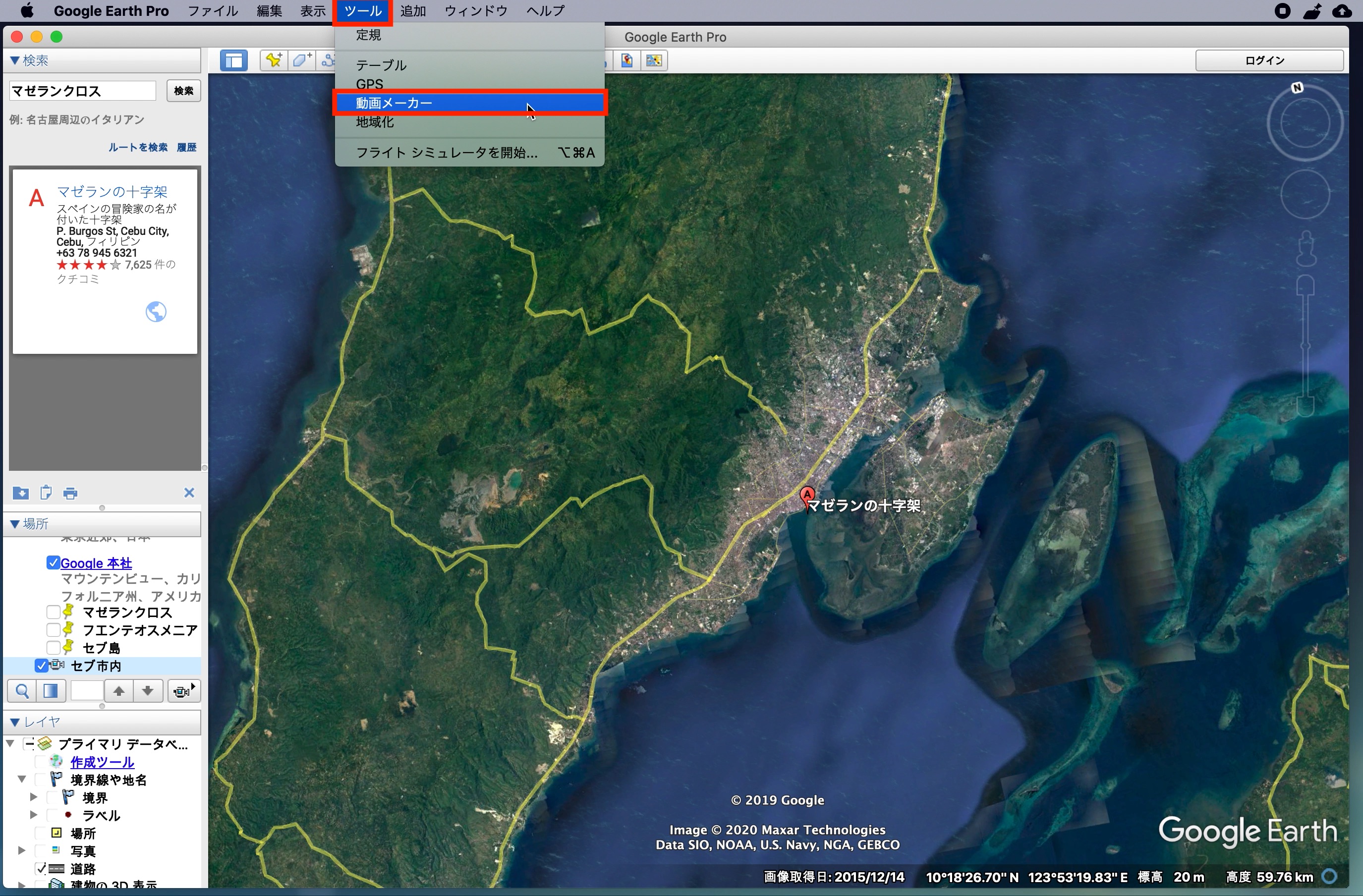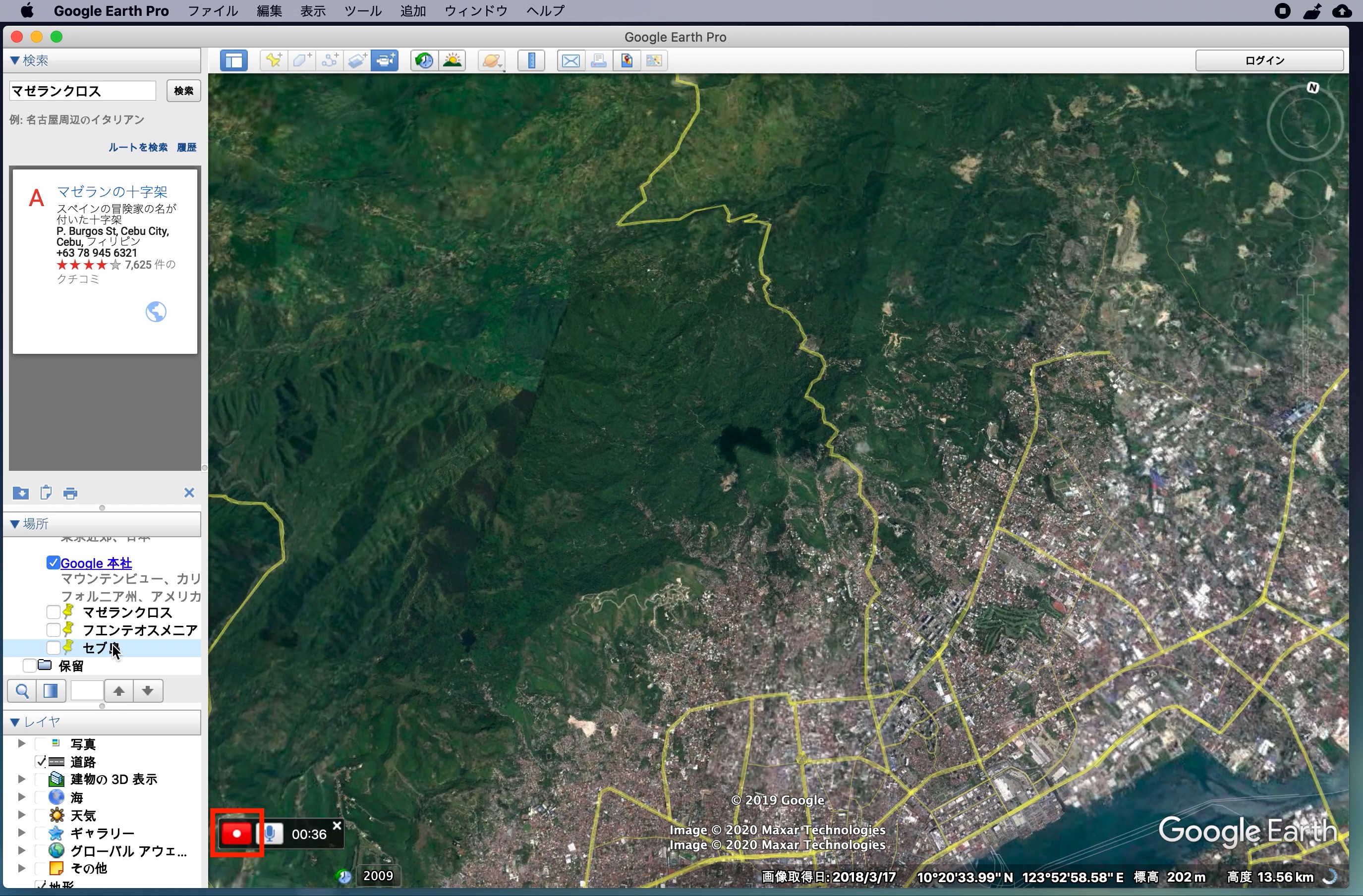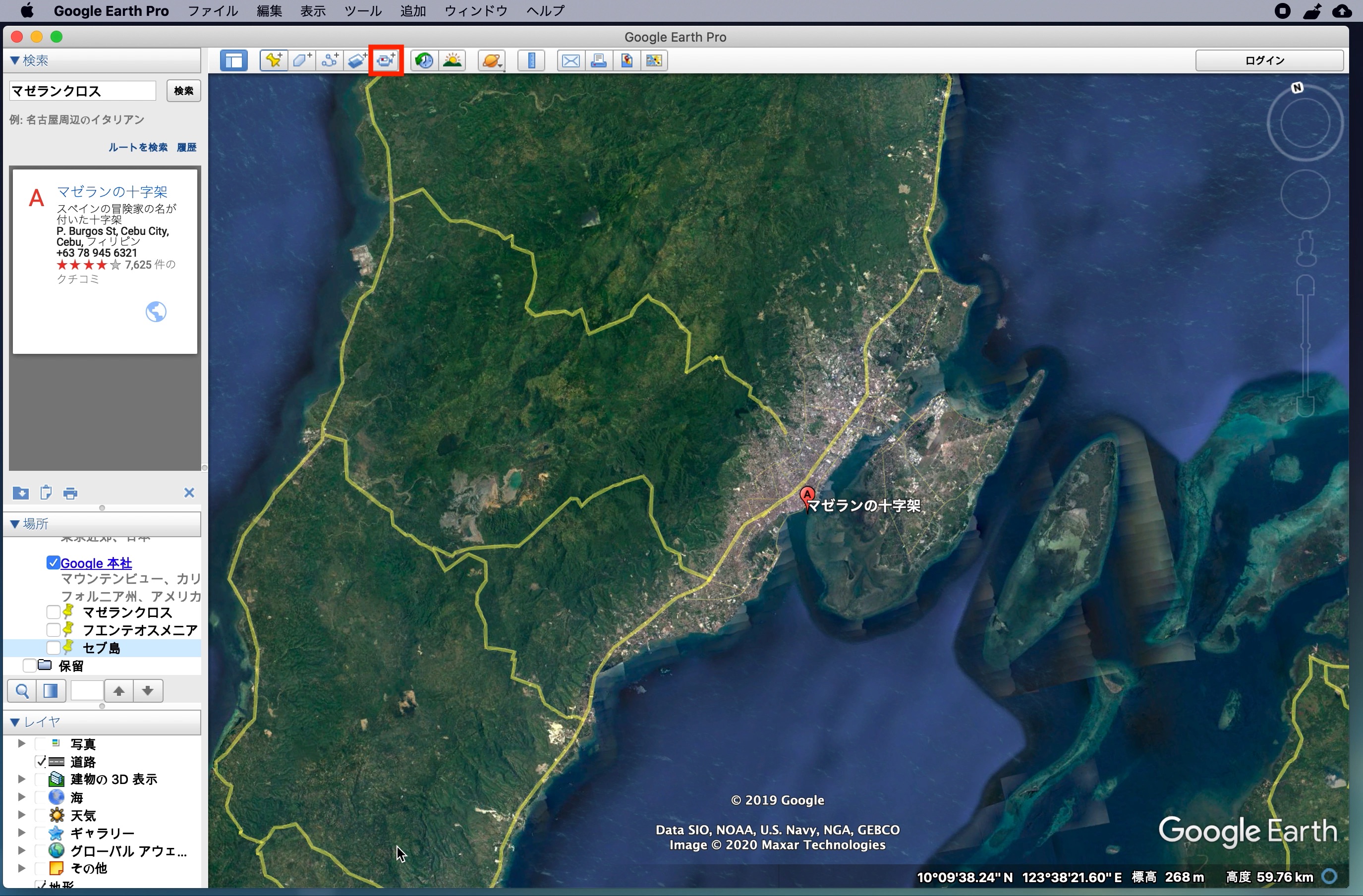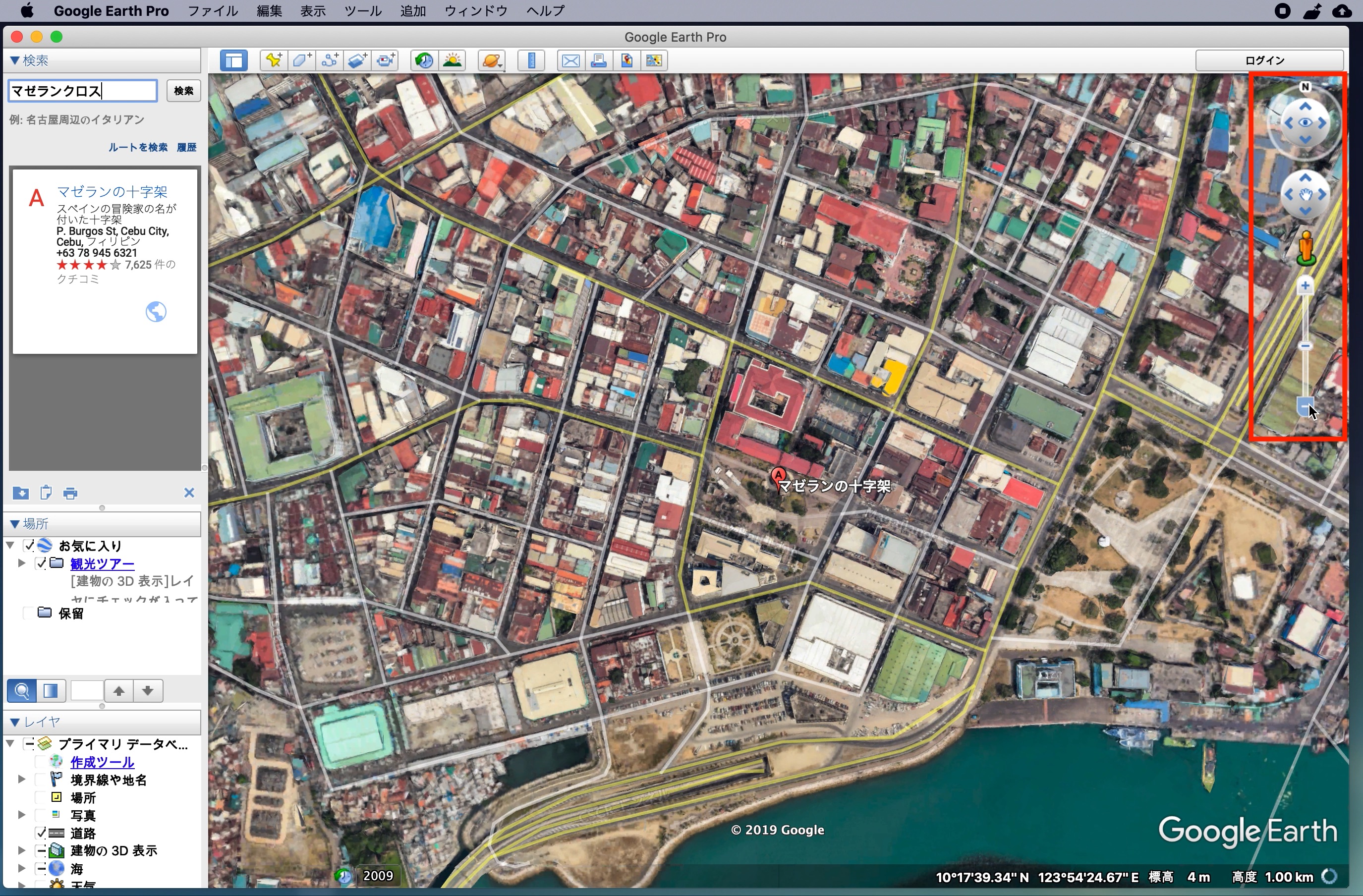 左上にある「検索」からGoogle Mapsと同じ感覚でロケーションを探すことができます。下の例ではセブ島の観光地の一つである「マゼランクロス」を探してみた例です。
