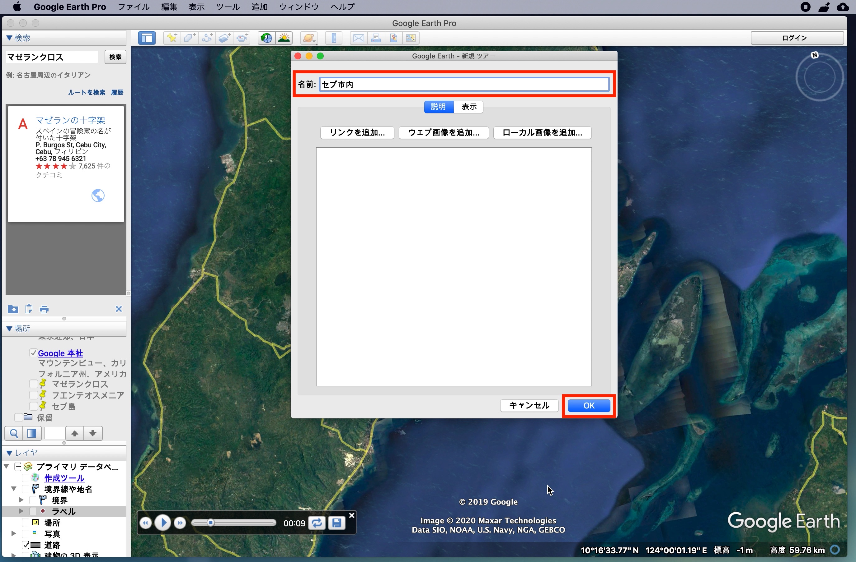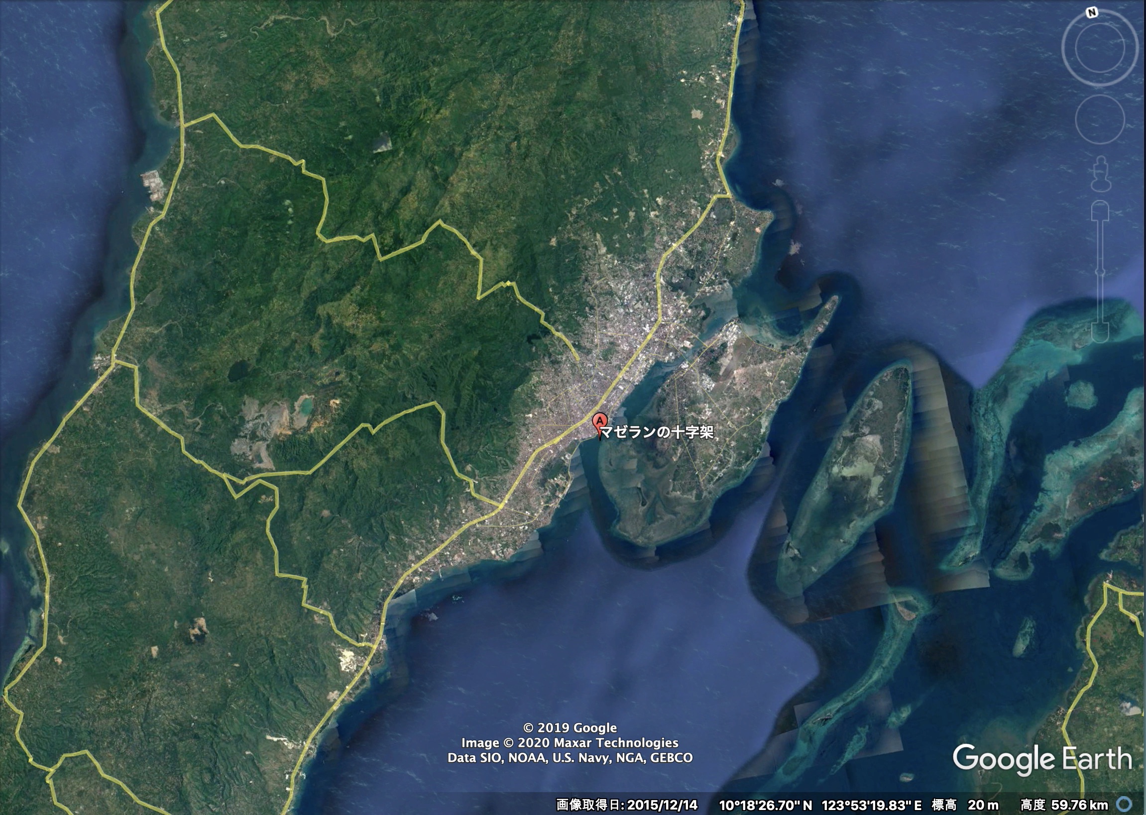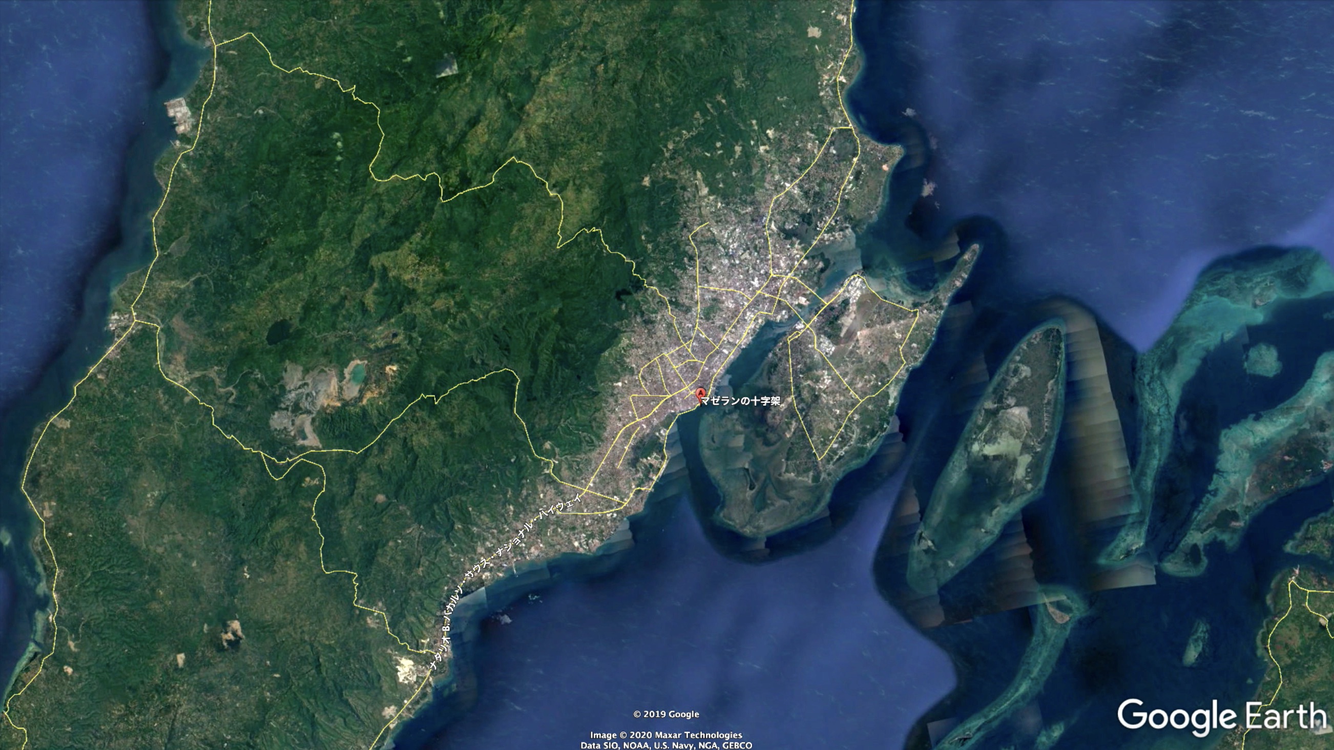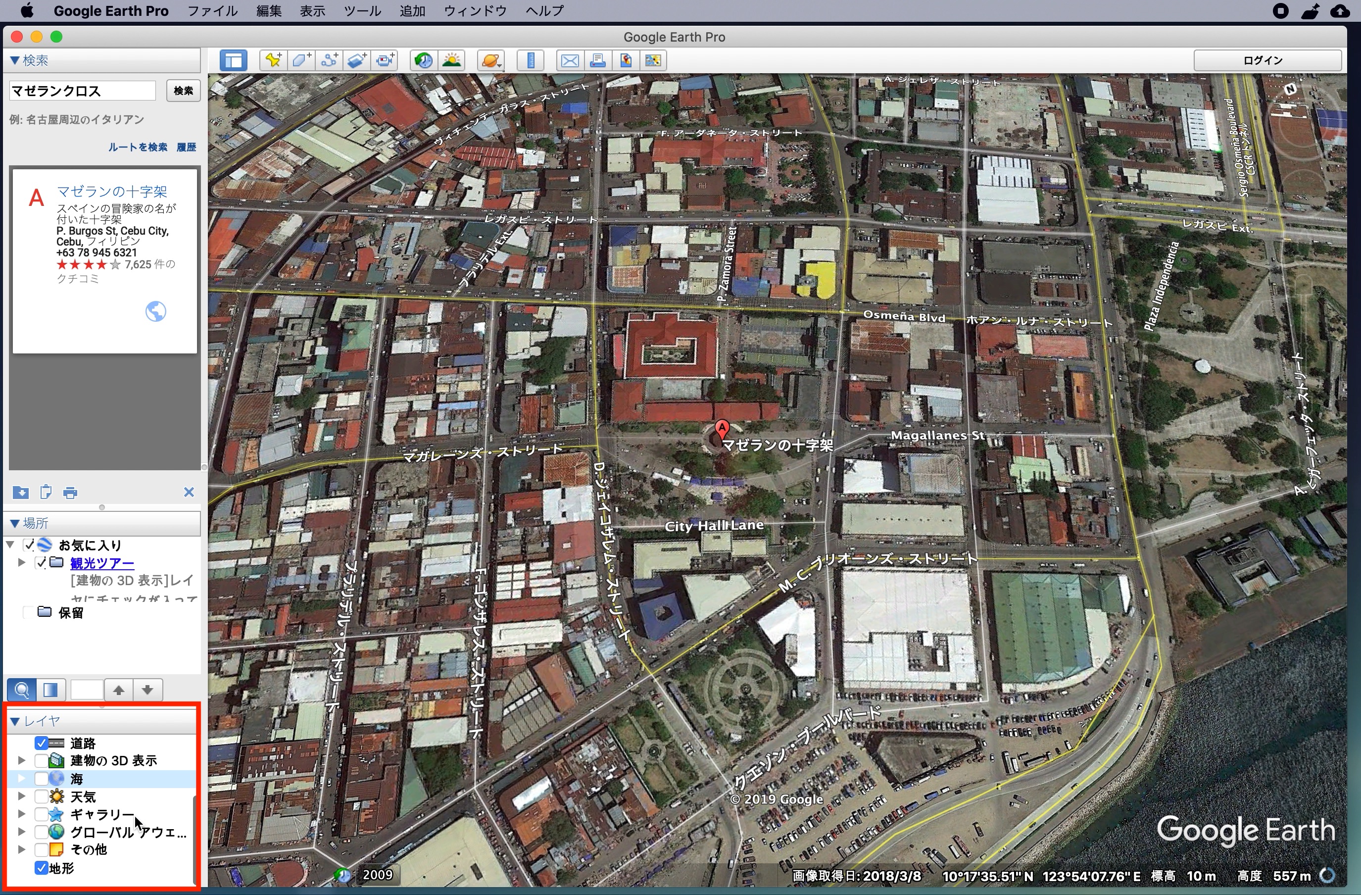 左上にある「検索」からGoogle Mapsと同じ感覚でロケーションを探すことができます。下の例ではセブ島の観光地の一つである「マゼランクロス」を探してみた例です。