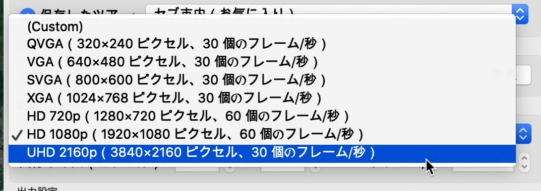 ドロップダウンメニューをクリックすると下のようなプリセットが用意されていますが、「Custom」を選択すると好みでサイズやフレームレートを変更できるようになります。