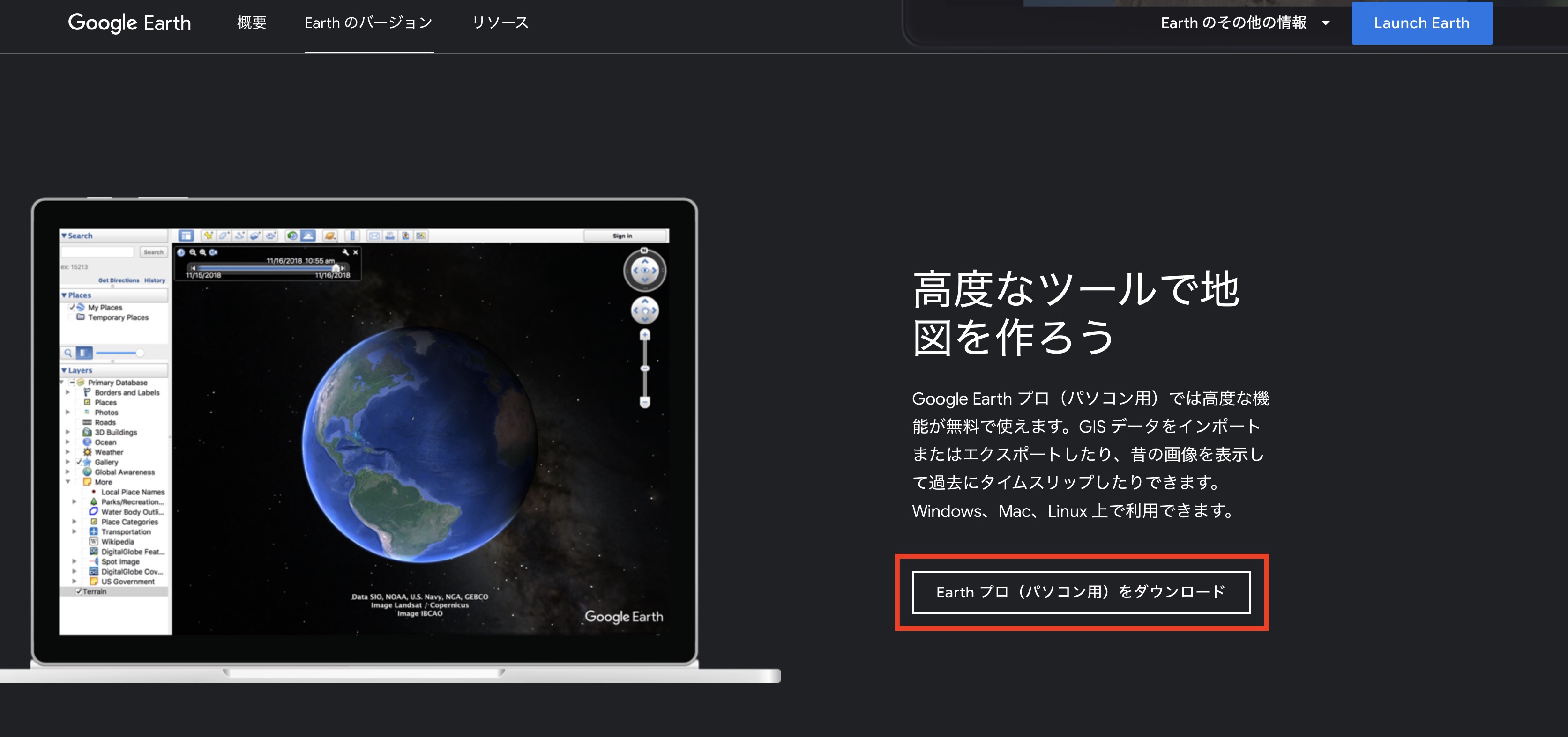 まず、Google Earthのページ内にある、「Earthのバージョン」をクリックすると利用可能なアプリが一覧で表示されるので、一番下にある「Earth プロ(パソコン用)」のボタンをクリックしてインストーラーをダウンロードします。