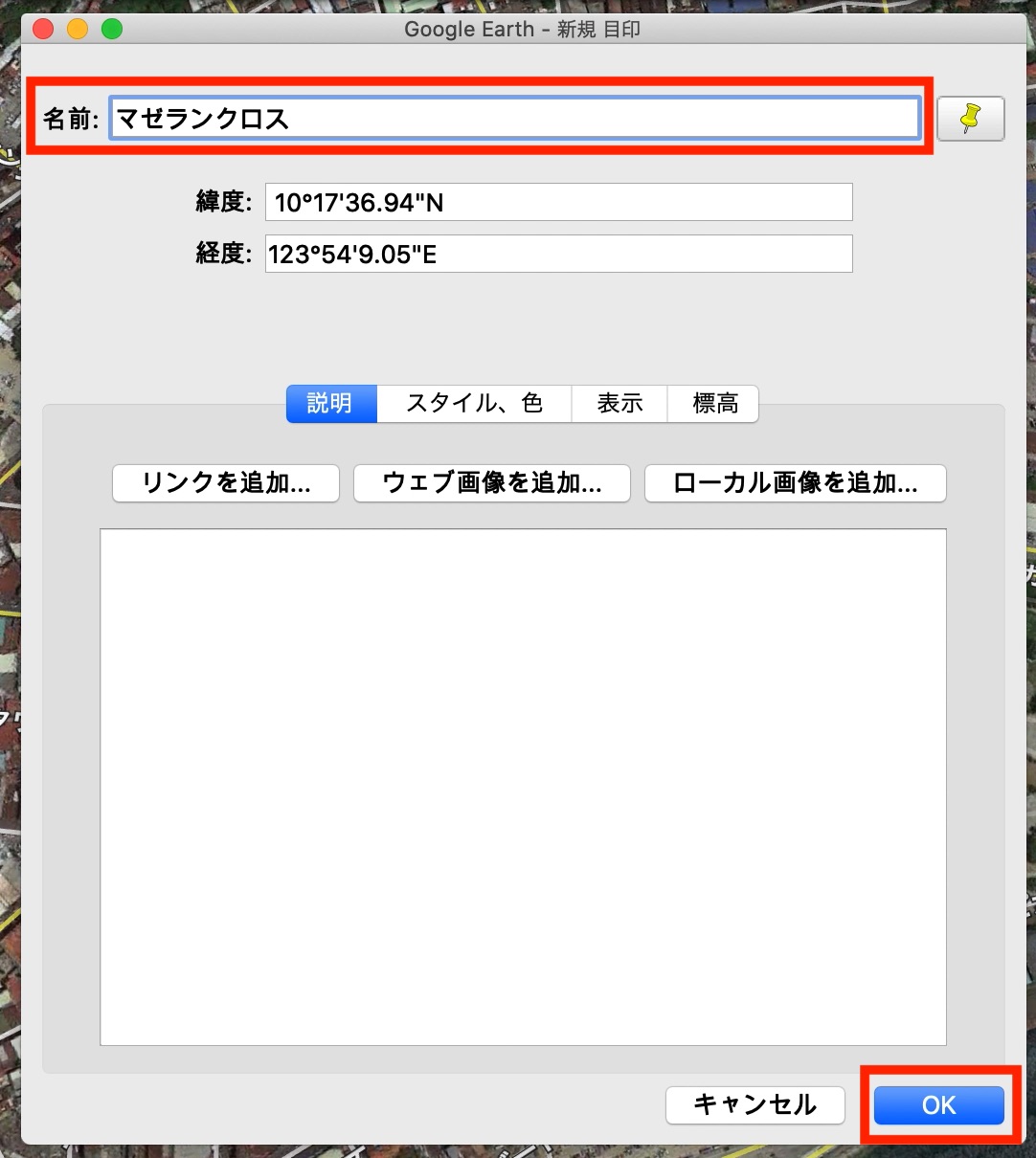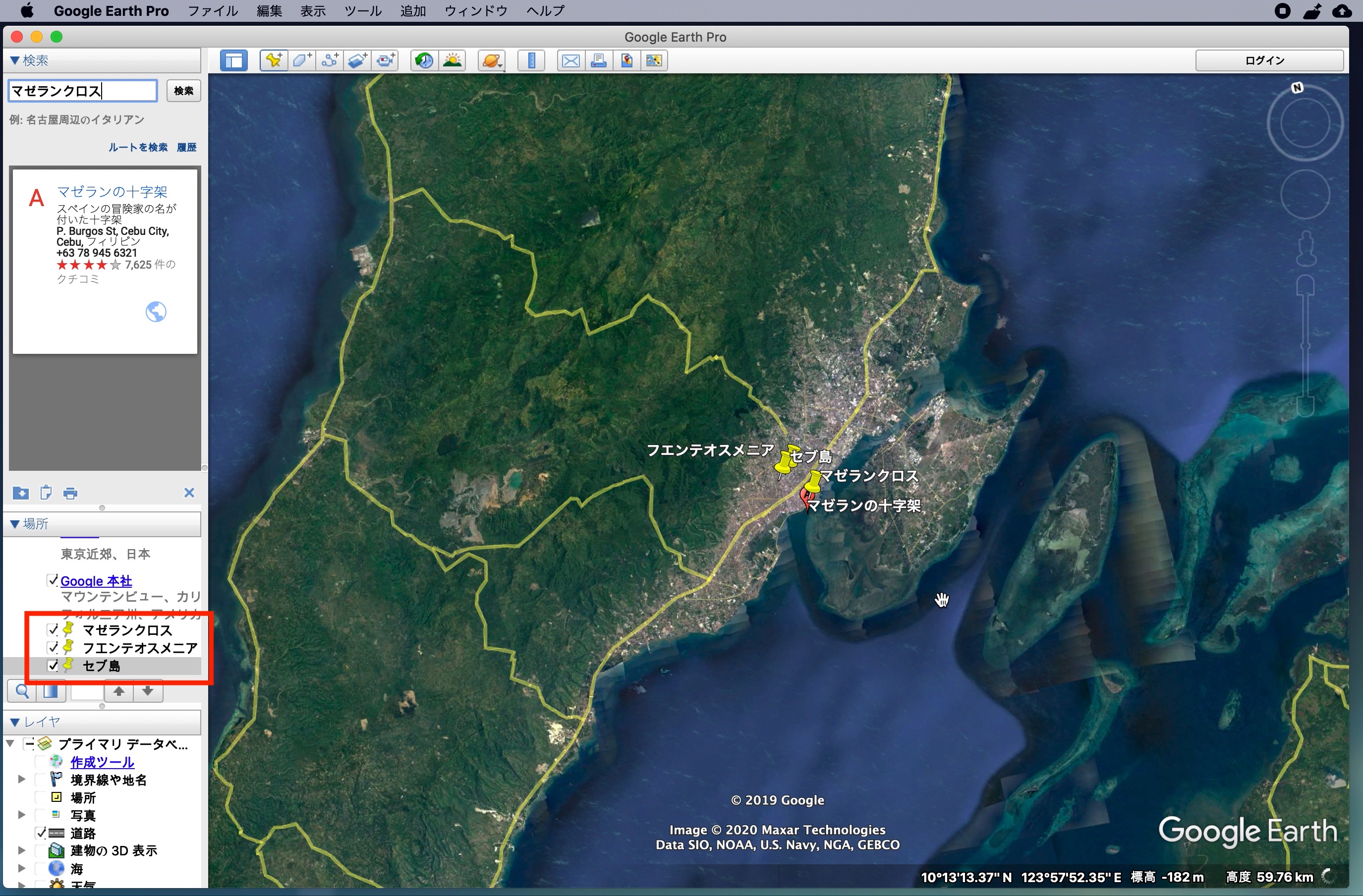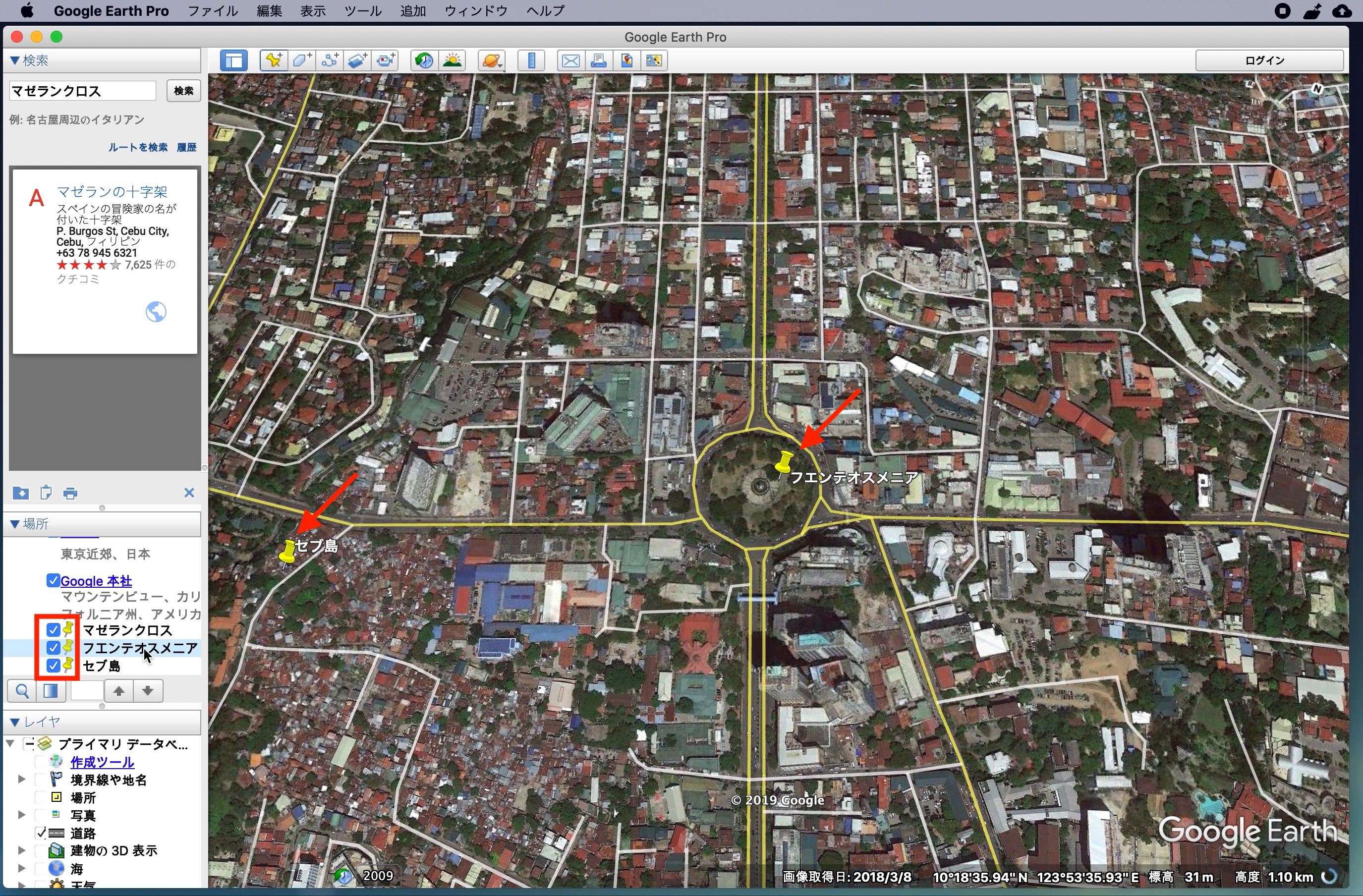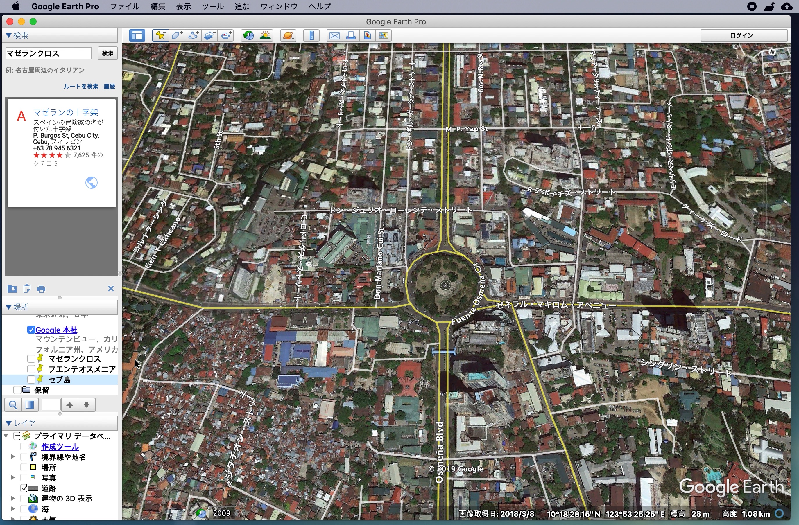 筆者の場合はマゼランクロス(A地点)、フエンテ(B地点)を表示した後で、島全体が見えるようにセブ島(C地点)として目印を作成しました。「場所」に保存した目印をクリックすることで、簡単に移動ができるようになります。