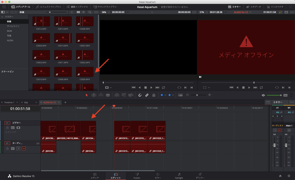 DaVinci Resolveではクリップや音声素材などといったメディアファイルを確認できないとプロジェクトウィンドウ、タイムライン、プログラムウィンドウなどが全て赤い「メディアオフライン」と表示されるようになります。