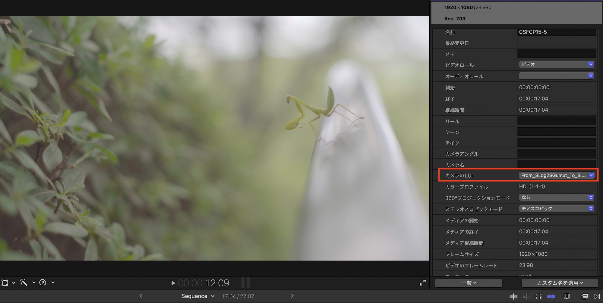 ツールを使用した色補正を行う前にS-Log2やCanon LogといったLOG撮影されたクリップの場合は予め基本補正LUTを適用させ、クリップが正しい明るさとコントラストになるようにします。