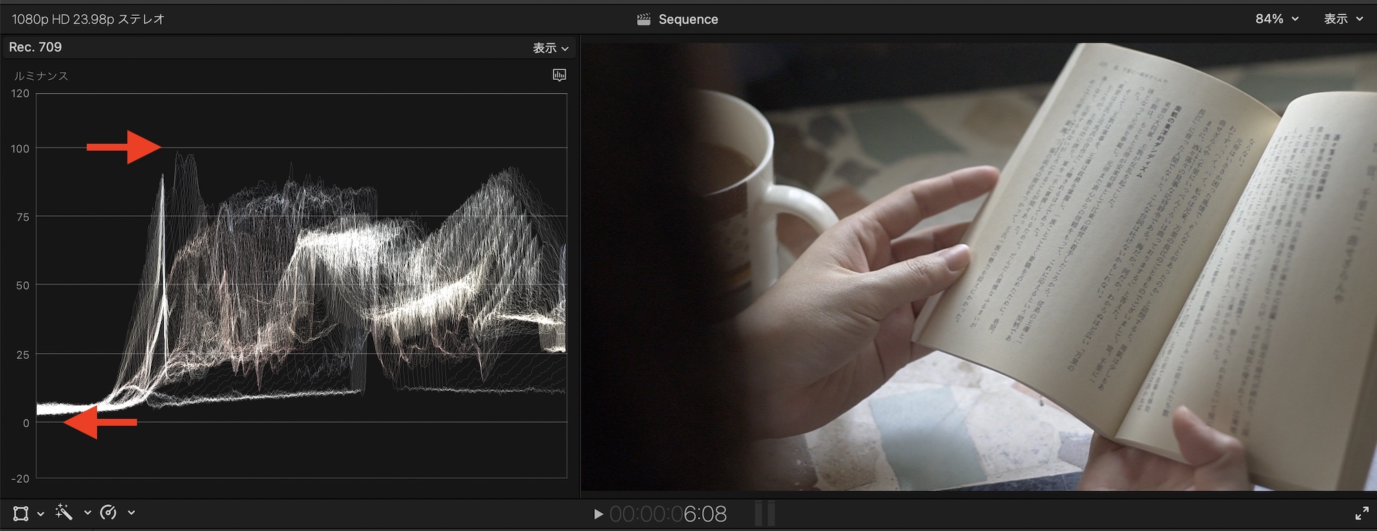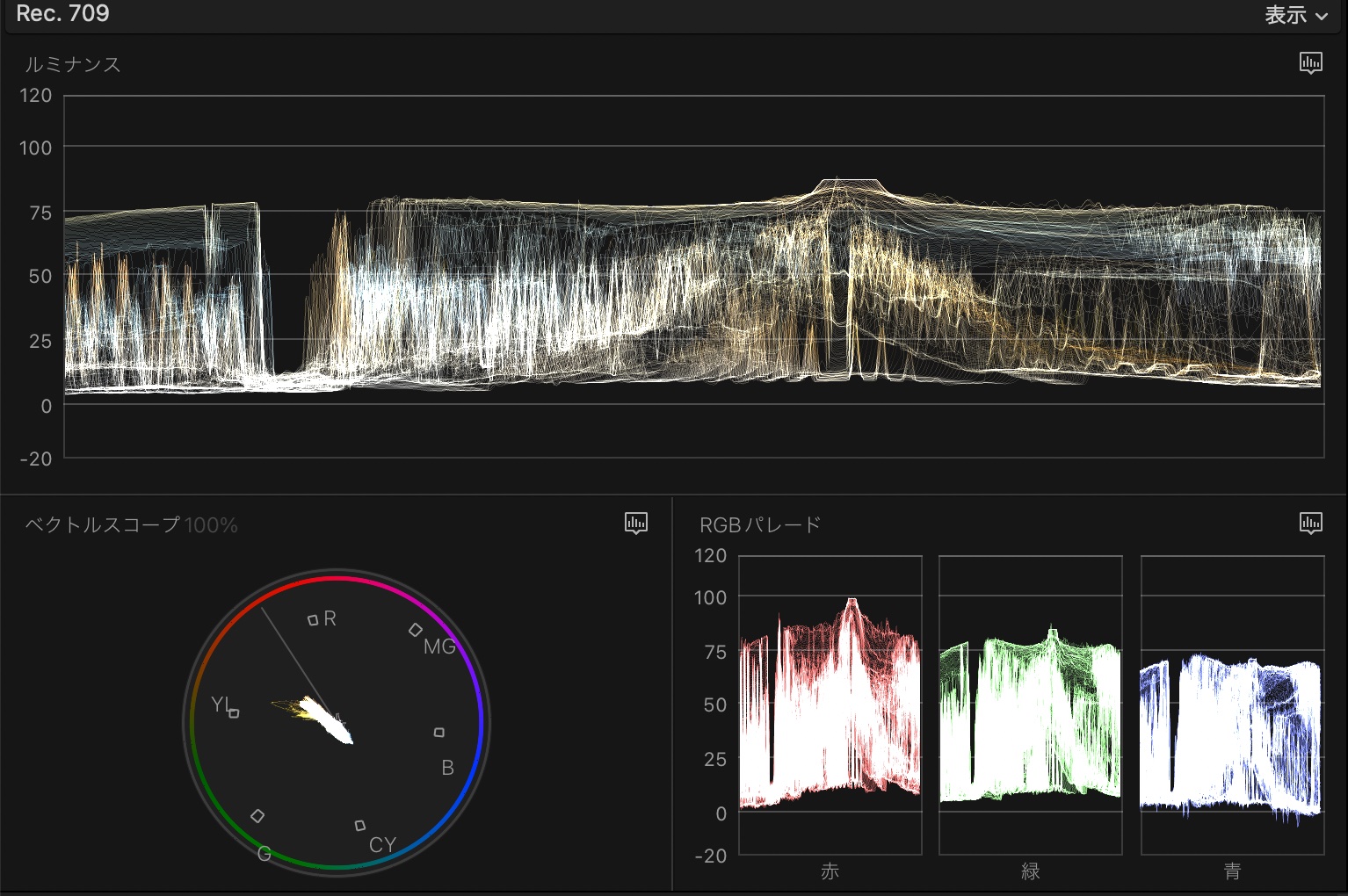 使用する編集アプリによってルミナンス・RGBパレードの表示されている数値は異なる場合がありますが、0 IREから100 IREと表示されていることが多く、1 IREから99 IREの範囲になるようにクリップの明るさを調整し、ミッドトーン(中間色調)をRGBカーブなどを使い微調整していきます。