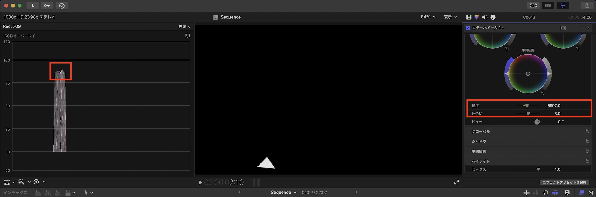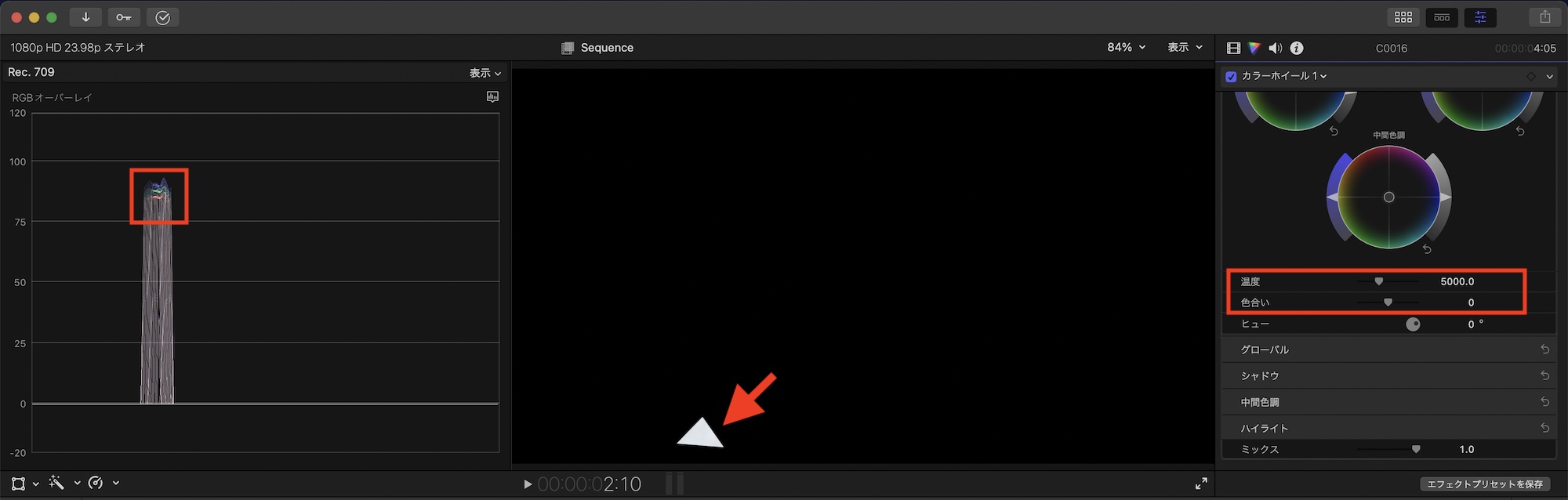 一番簡単な方法としてクリップに写る白い範囲をマスクで切り取り、RGBオーバーレイを確認しながらエフェクトにある色温度と色合いを動かしながら、白色になるまで調整します。