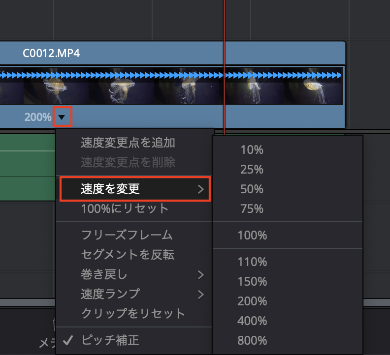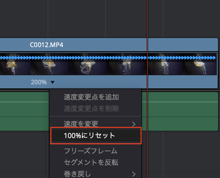 その「200%」の横にある三角アイコンをクリックする事でクリップの速度を変更したり、リセットなどの詳細設定を行うことも出来ます。