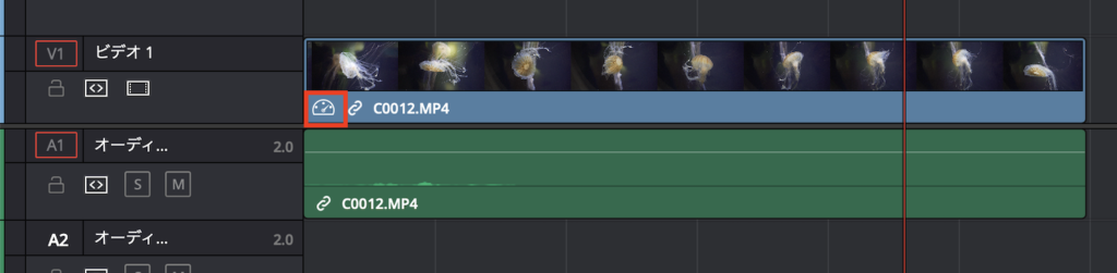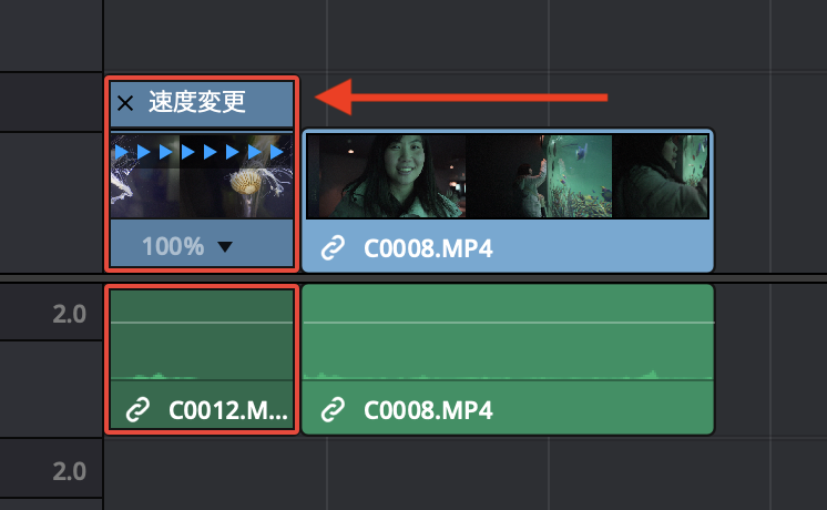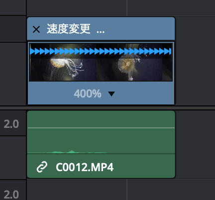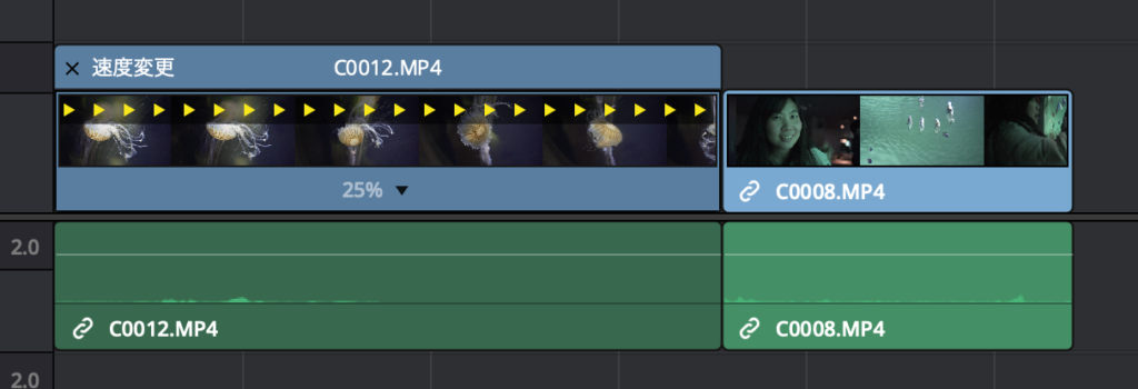 また速度の変更が適用されているクリップの下の部分には、スピードメーターのアイコンが追加されています。