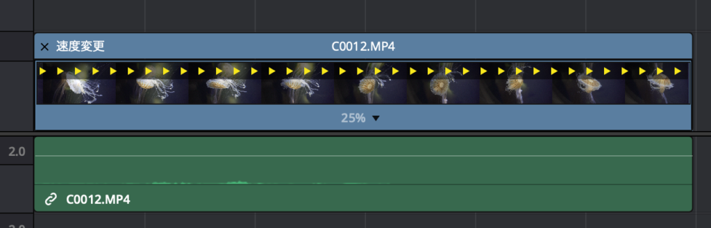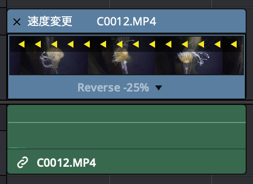 また「25%」などの100%以下の場合は黄色い矢印が表示されます。逆再生にした場合はクリップの下部が「Reverse-数値%」と表示され、矢印が反対方向になります。