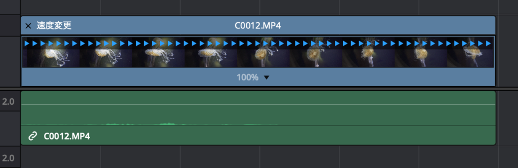 「速度変更」と書かれたバーの下には青い矢印が右向きに並んでおり、下に表示されている数字はクリップの速度になります。筆者の場合は先程クリップを「200%」にしてたので、「200%」と表示されています。