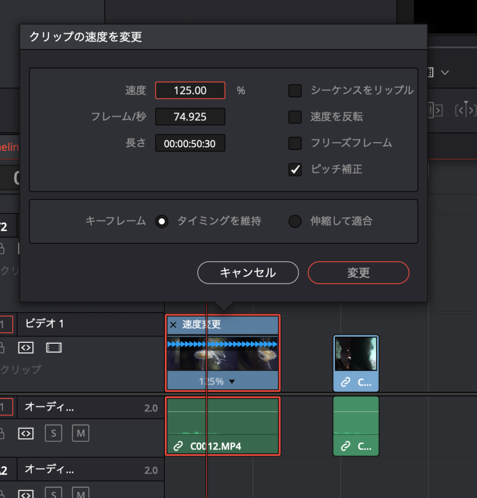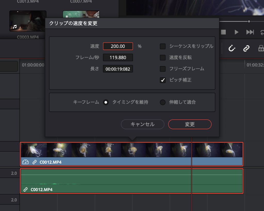 上を例に見てみると、「速度」の部分を「100%」から「200%」に変更した場合、「フレーム/秒」と「長さ」が速度に合わせて変更されているのが分かると思います。