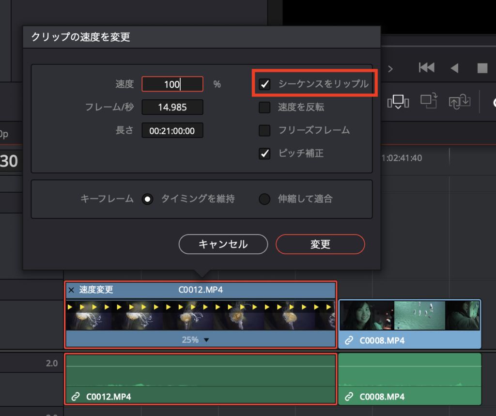 先程紹介した方法とは逆に「100%」のクリップを「25%」に変更した場合、「シーケンスをリップル」にチェックが入っていないと、後に続くクリップが上書きされてしまうので注意しましょう。このオプションは編集の状態に合わせて変更すると良いと思います。