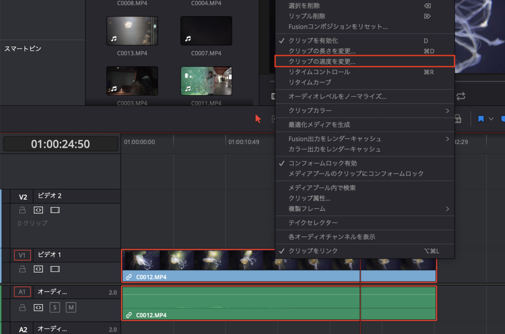 メディアプールからタイムラインにクリップをドラッグ・アンド・ドロップするか、タイムライン上にあるクリップを選択して、右クリックの「クリップ速度を変更」を選択します。