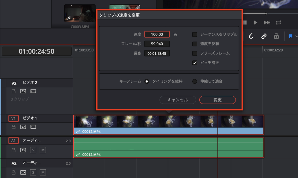 [DaVinci Resolve] タイムラインにあるクリップの速度変更や逆再生をしてみよう!
