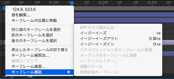 一番クラシックな方法はイージングを行いたいオブジェクトのキーフレームをタイムラインで選択して、右クリック「キーフレーム補助」の中にある「イージーイーズ」、「イージーイーズアウト」、「イージーイーズイン」から選ぶ事で適用させる事が出来ます。