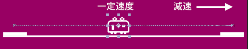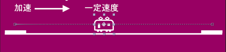 電車が通過するだけのアニメーションであればリニア補間のままでも良いと思いますが、下の例の様なイージングを加える事で発車と停車を表現できる、より自然なアニメーションが完成しているのがわかります。