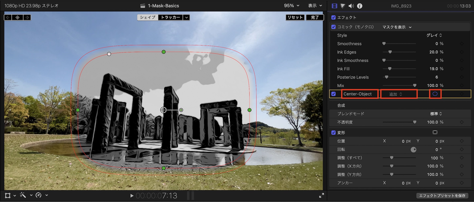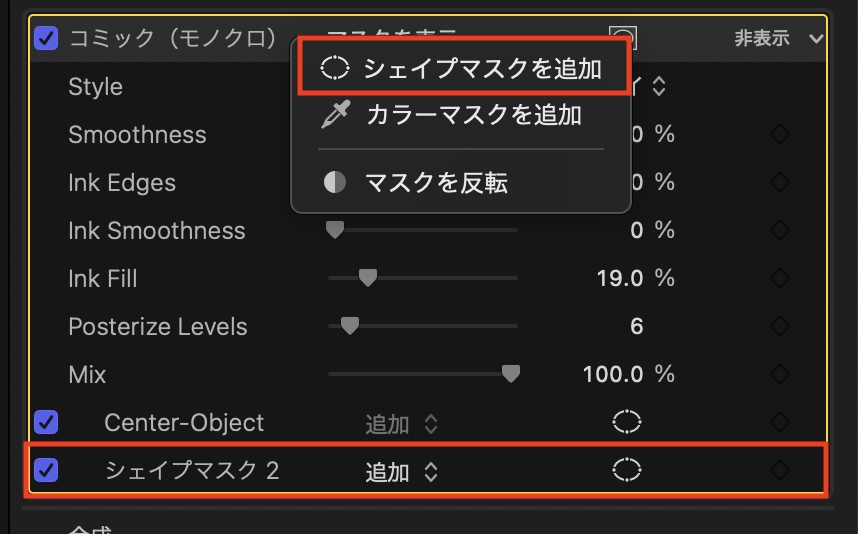 インスペクタ側でのマスクの操作はシンプルになっており、左からマスク名をダブルクリックして名称を変更したり、2つ以上のマスクがある場合のブレンドモードの切り替え、そしてマスクのコントローラーの表示・非表示設定を行うアイコンが用意されています。上の画像の例では名称を「Center-Object」に変更しています。