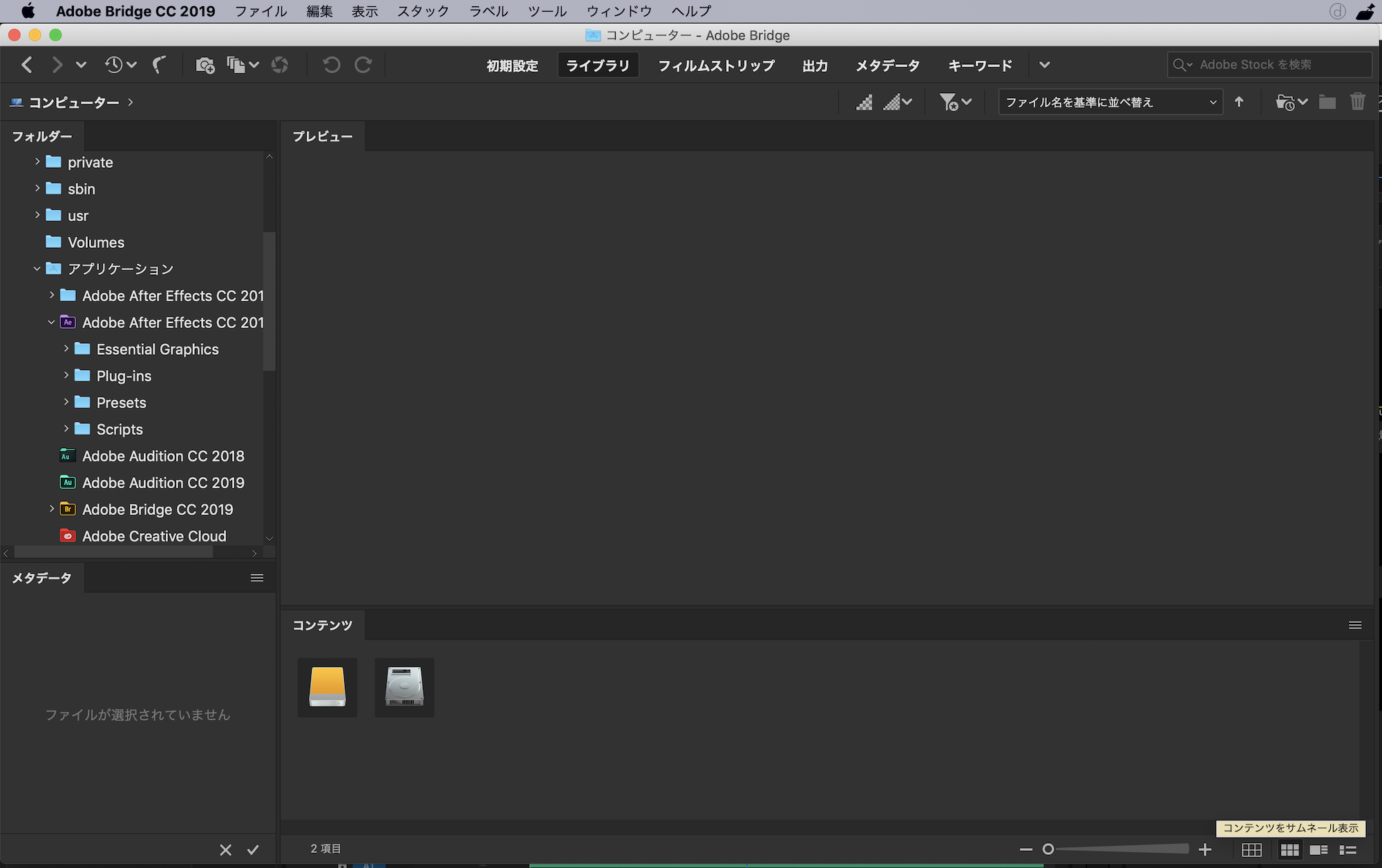 Adobe Bridgeがまだインストールされていない場合はCreative Cloudアプリから入手すると良いでしょう。Adobe Bridgeを起動するとファイルマネージャーのような画面が現れます。