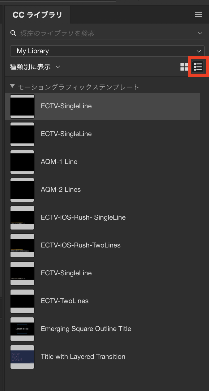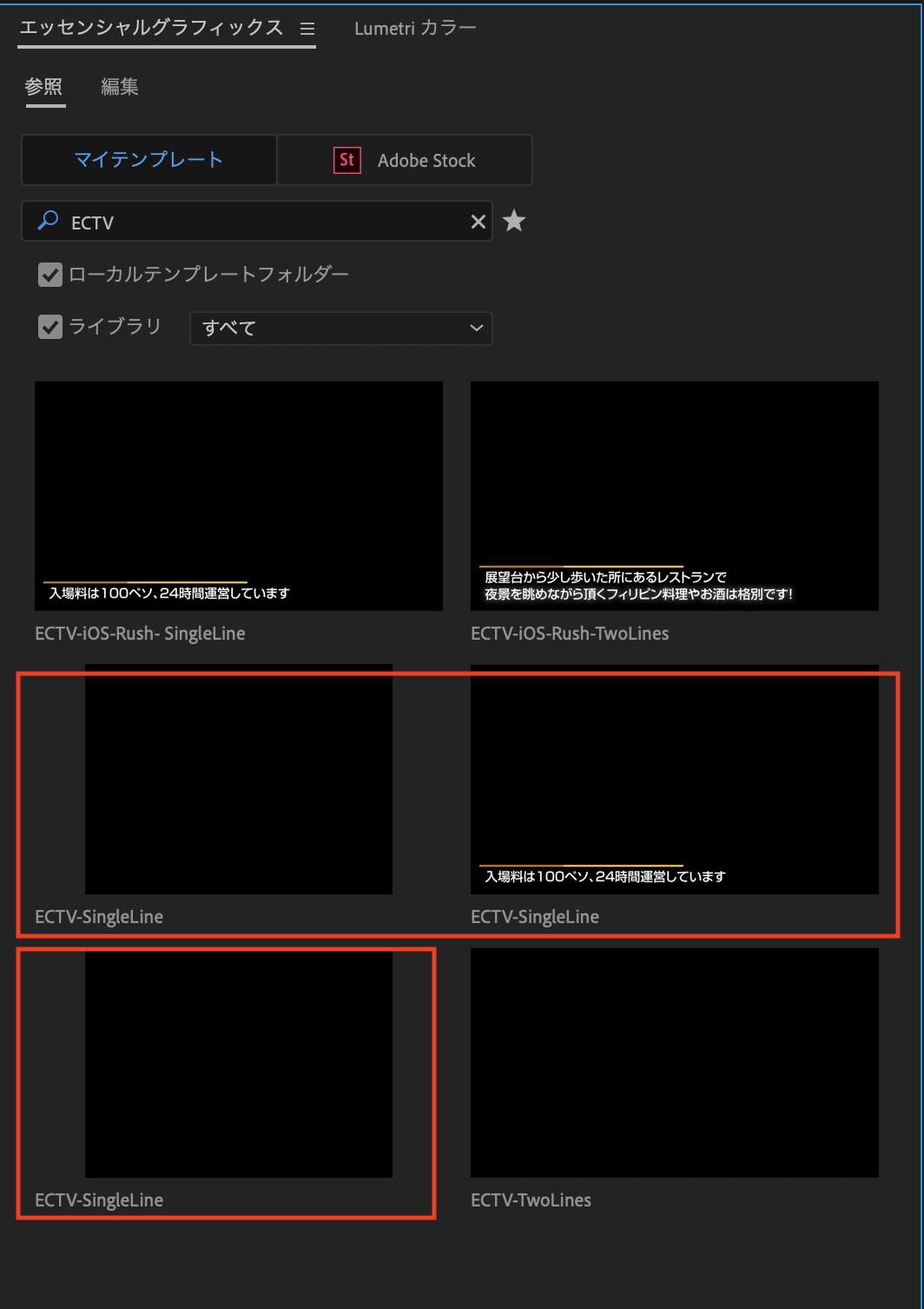 しかし、「My Library」を選択すると上のようなウィンドウは現れず、Premiere Proのエッセンシャルグラフィックスのタブを見てみると同じファイル名のモーショングラフィックスが複数保存されています。