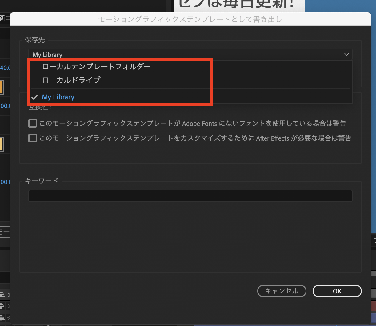 エッセンシャルグラフィックスを作成する際、保存先としてパソコンや外付けドライブに保存できる「ローカルテンプレートフォルダー」、「ローカルドライブ」とAdobe Creative Cloudにアップロードする「My Library」のオプションが用意されています。