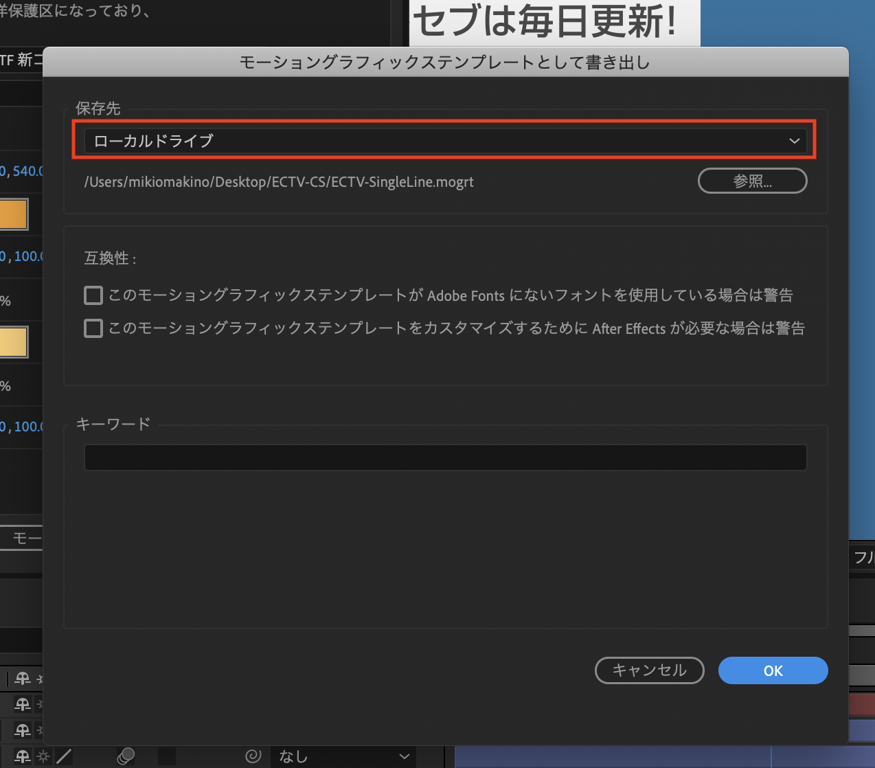 After Effectsで作成し、エッセンシャルグラフィックスとして書き出したプロジェクトを「ローカルテンプレートフォルダー」や「ローカルドライブ」で保存したとします。