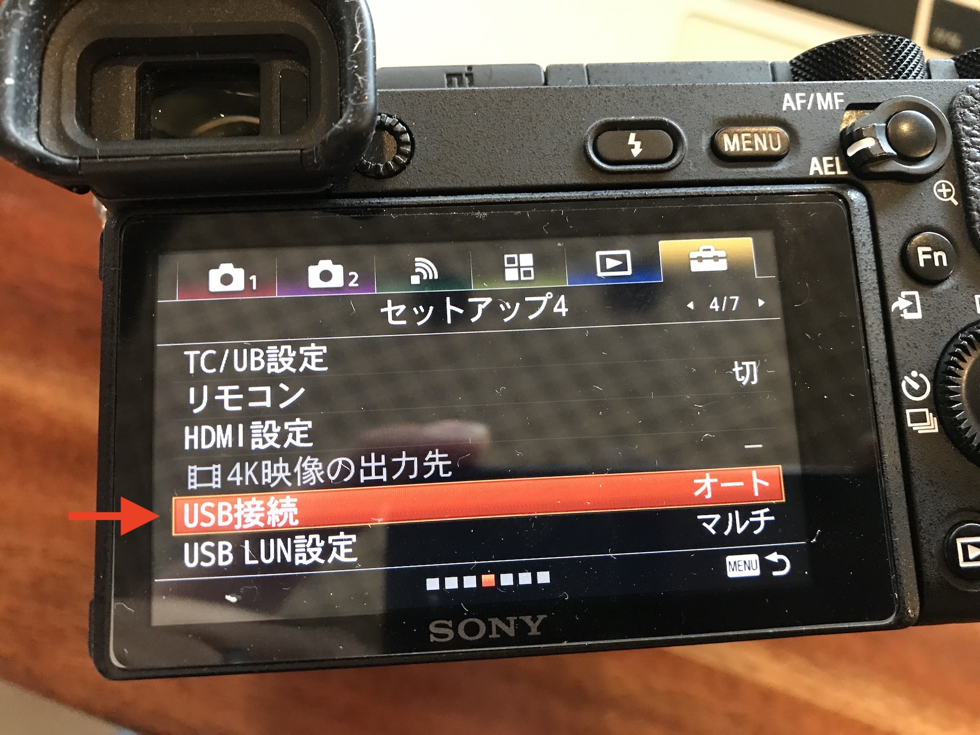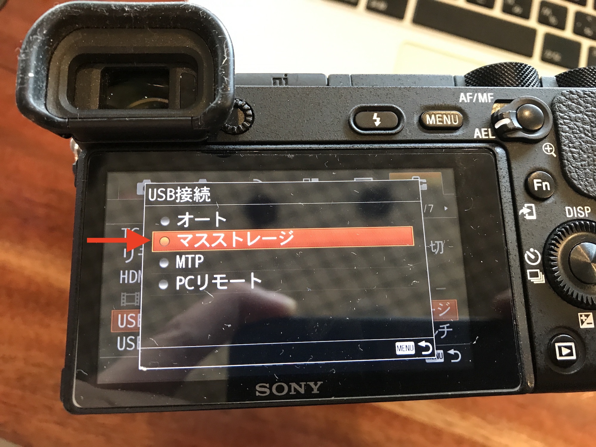 まず、メニューの「セットアップ」の「USB接続」はデフォルトで「オート」になっていると思うので、ここを「マスストレージ」に変更します。
