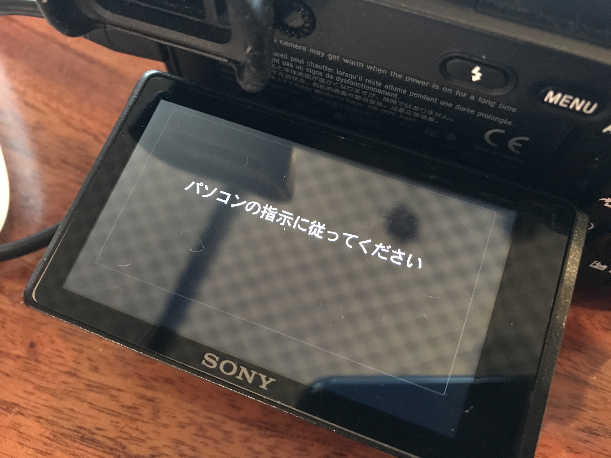 環境などによるかもしれませんが、筆者の場合は10分程度かかりました。アップデート中、カメラの画面は「パソコンの指示に従ってください」が表示されています。