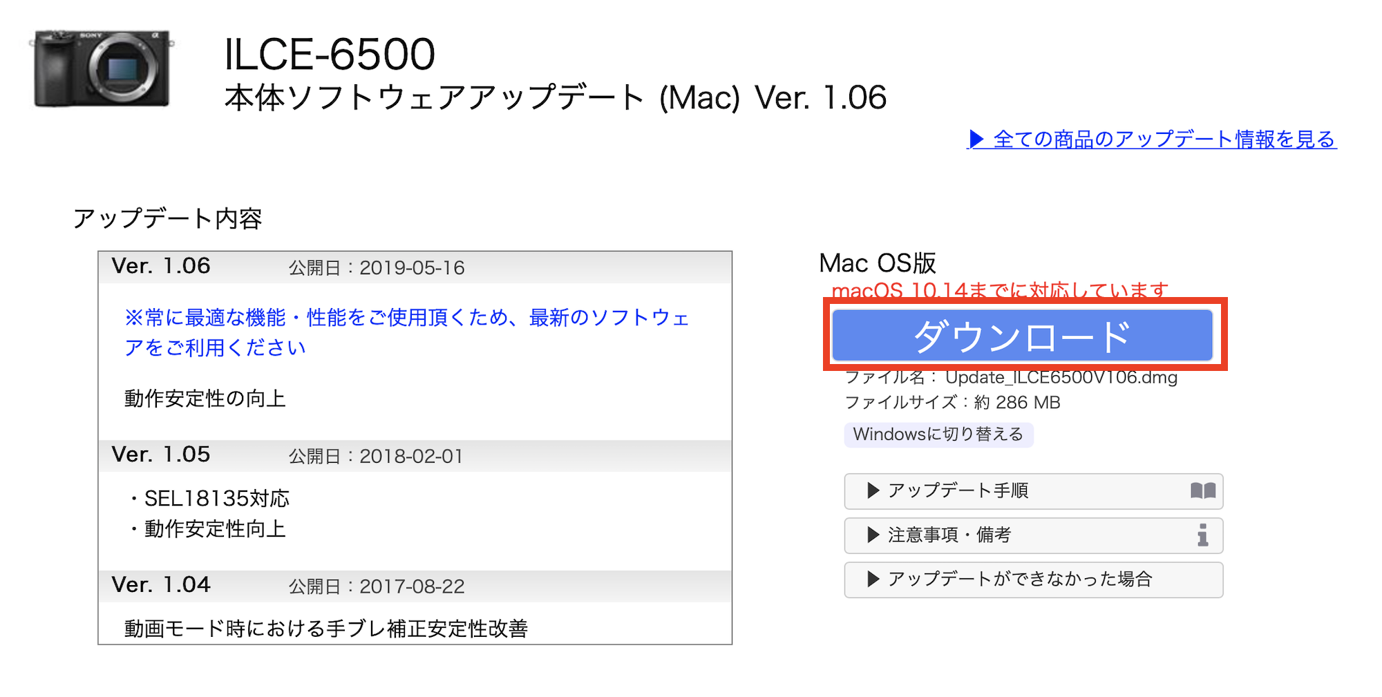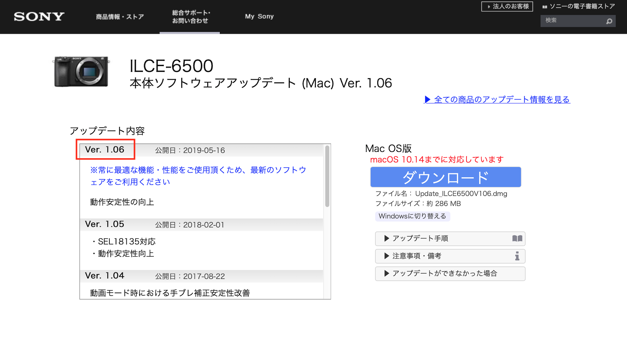 a6500のページを確認してみると「Ver.1.06」があったので、今回はこちらを適用してみましょう。
