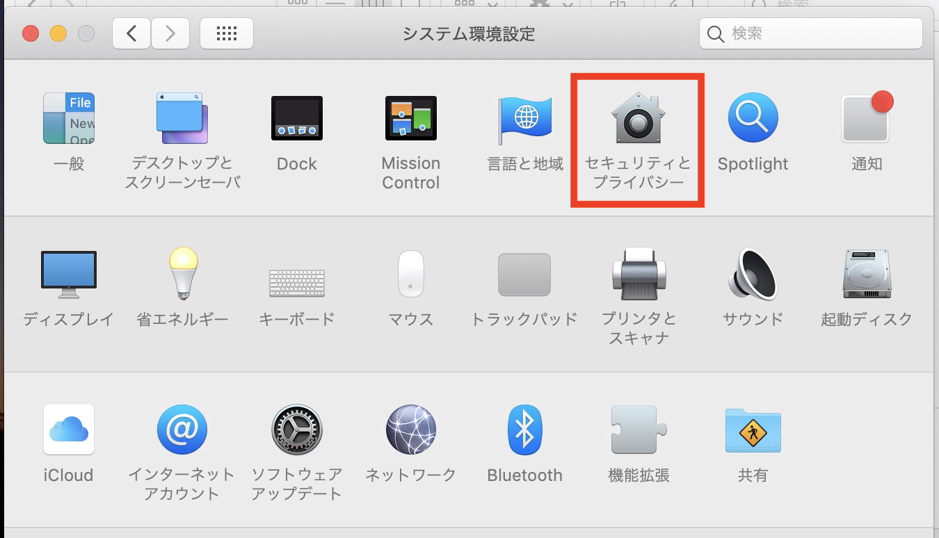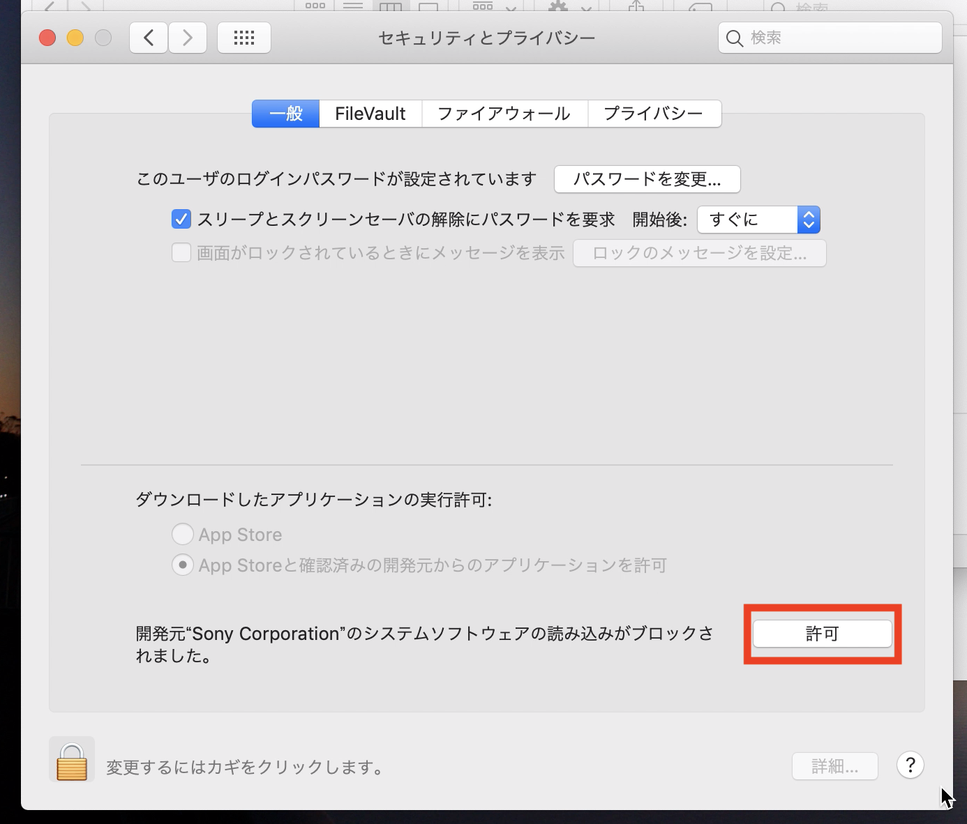 環境設定から「セキュリティとプライバシー」の項目に移り、「一般」のタブにある「・・システムソフトウェアの読み込みがブロックされました」項目の「許可」をクリック。