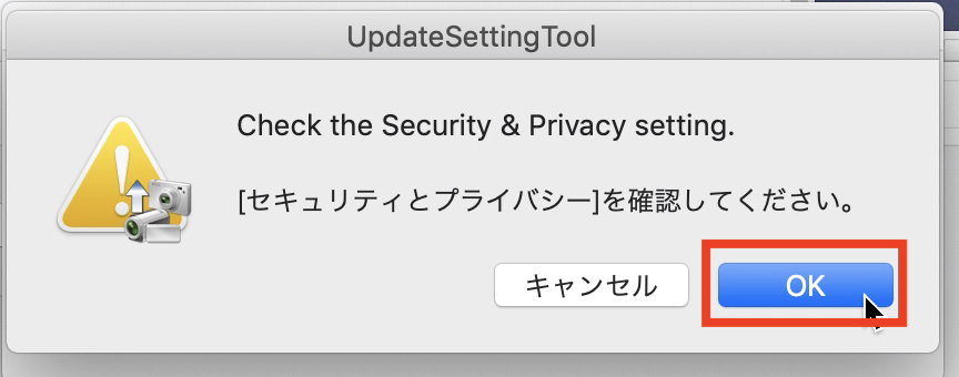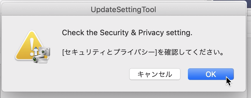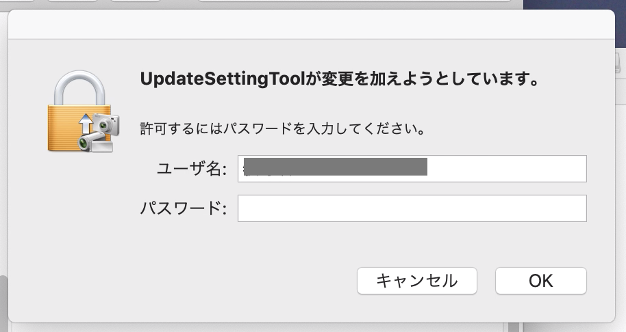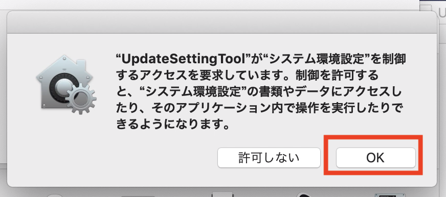 そのあとで「”UpdateSettingTool”が”システム環境設定を制御するアクセスを要求しています”」が表示されるので「OK」をクリックします。