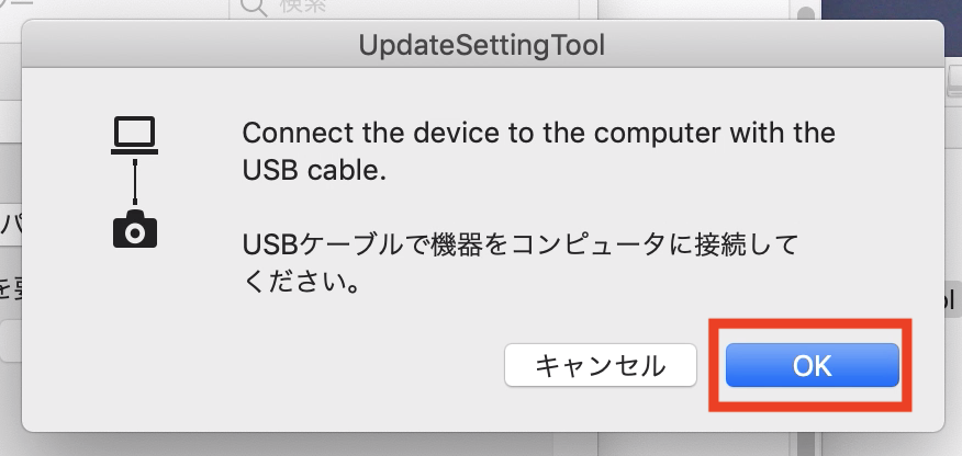 「USBケーブルで機器とコンピューターに接続してください」のウィンドウが現れるので、カメラとパソコンをUSBケーブルで接続し「OK」をクリック、ソフトウェアを起動します。