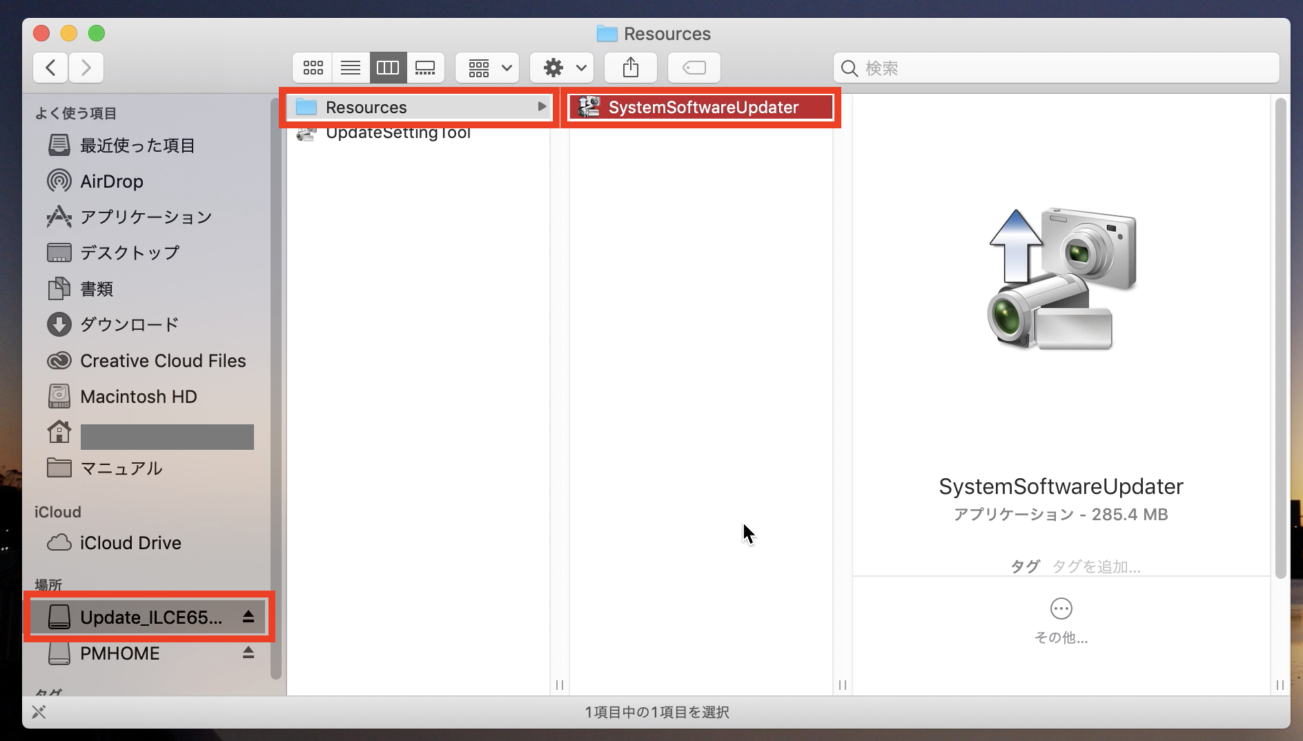 その際はダウンロードしたDMGファイルの中にある「Resources」フォルダーの「SystemSoftwareUpdater」クリックするとソフトウェアが起動します。