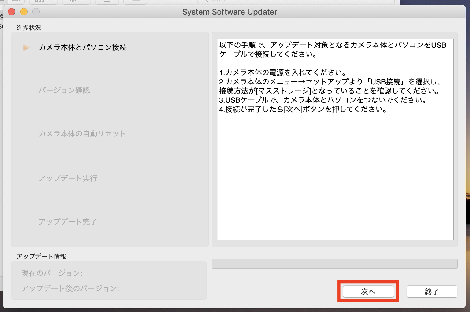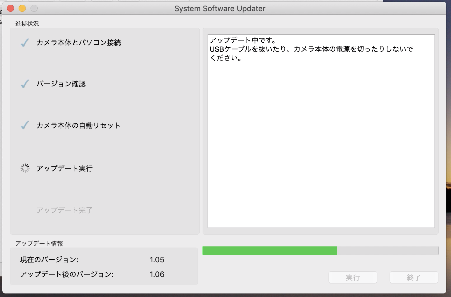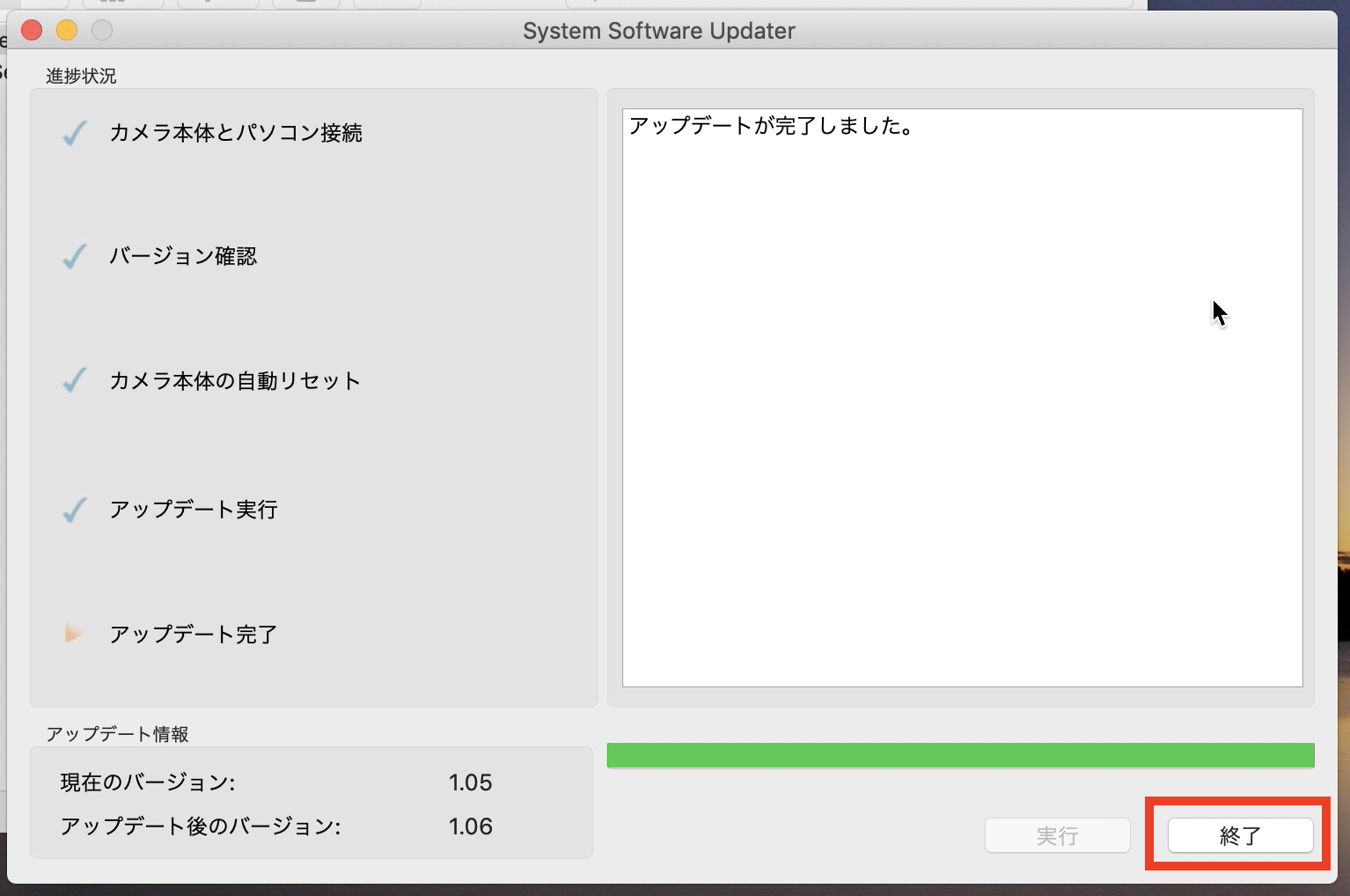 「アップデートが完了しました」と表示されれば、全ての作業が完了します。「終了」をクリックして、接続しているUSBを抜きましょう。