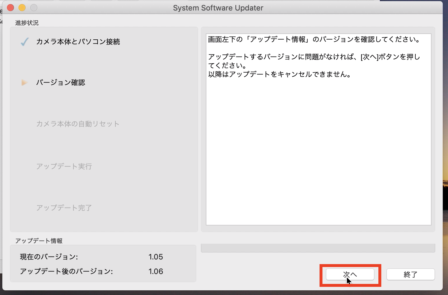 「バージョン確認」の項目でアップデートするバージョンに問題がなければ「次へ」をクリックしましょう。