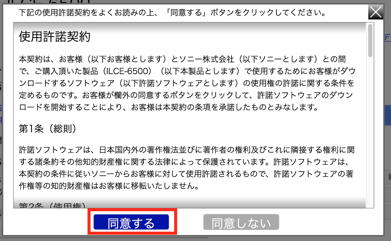 ページ内にある「ダウンロード」のボタンをクリックし、「利用規約」のウィンドウが表示されるので、「同意する」を選択します。