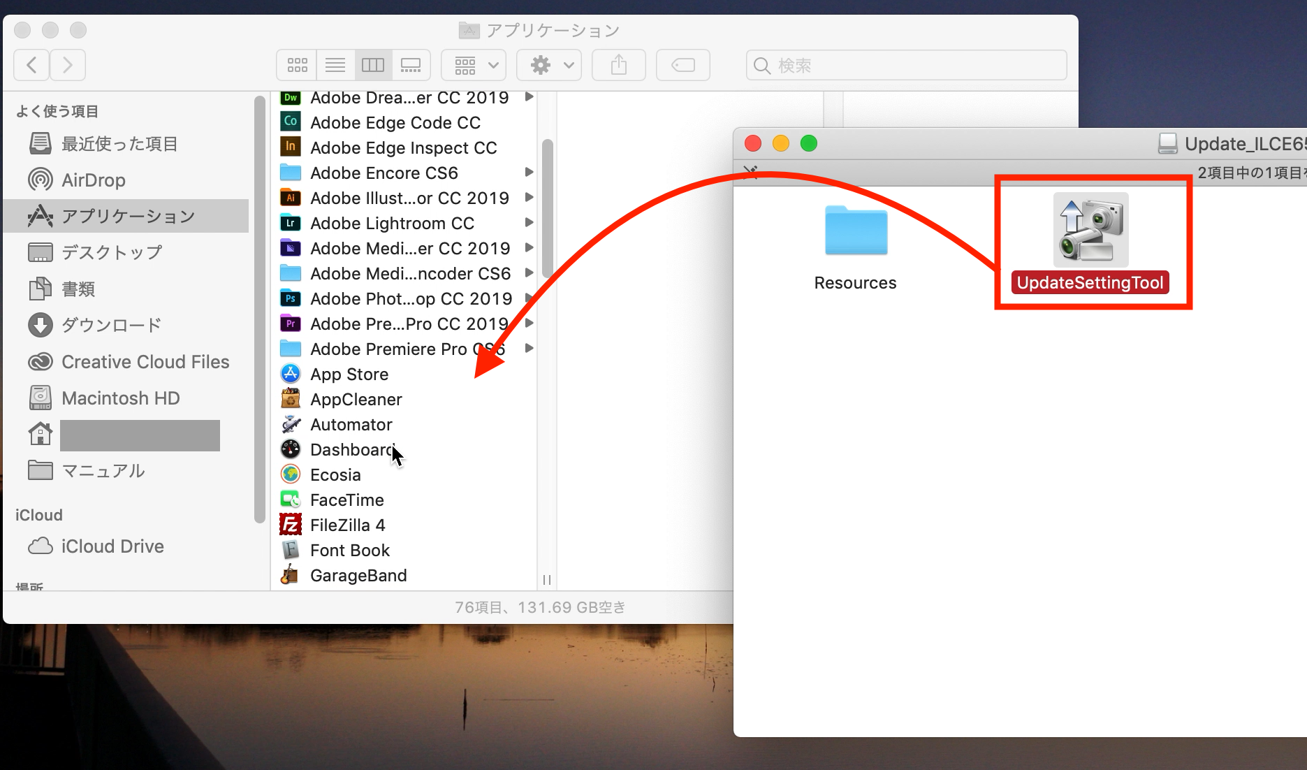 macOSでDMGファイルを展開し、「Update Setting Tool」をアプリケーションフォルダーに移動させるか、そのまま起動します。