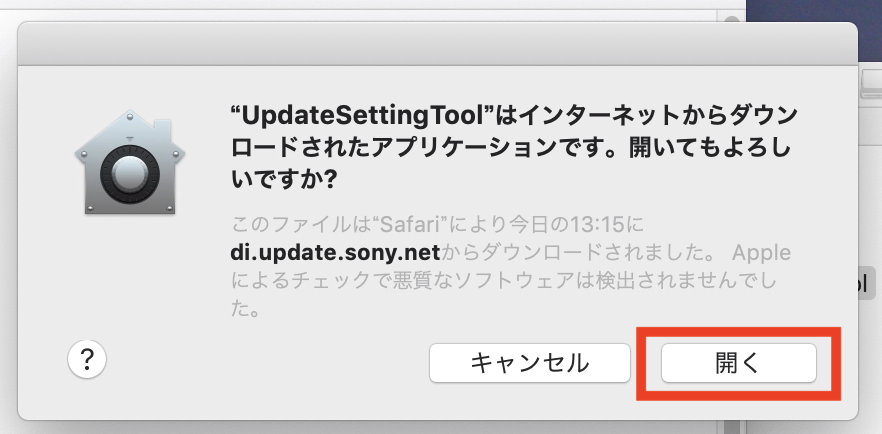 「”UpdateSettingTool”はインターネットから・・」のウィンドウが現れるので「開く」をクリック後、パスワードの入力画面でパスワードを入力。