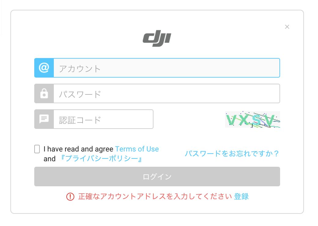 DJIのサポートではユーザーログインが必須のようであったので、右上にある「ユーザーログイン」からIDとパスワード、画像認証を入力し、「I have read and agree..」の部分にチェックを入れてログインしましょう。