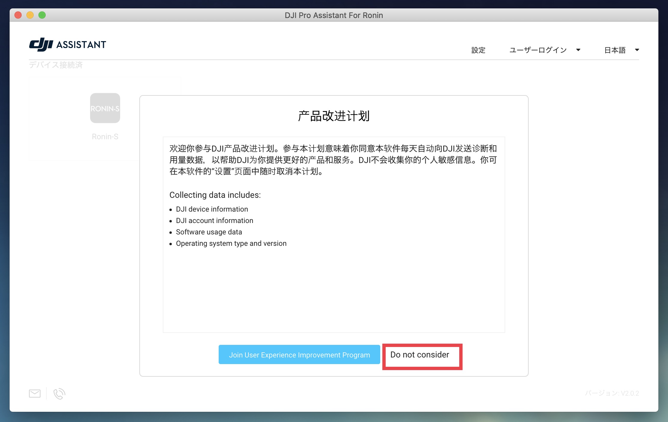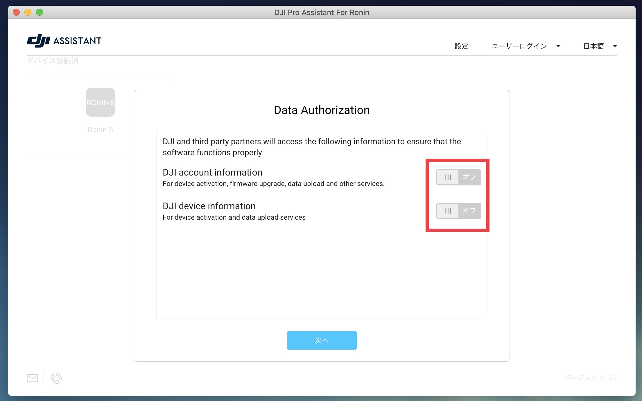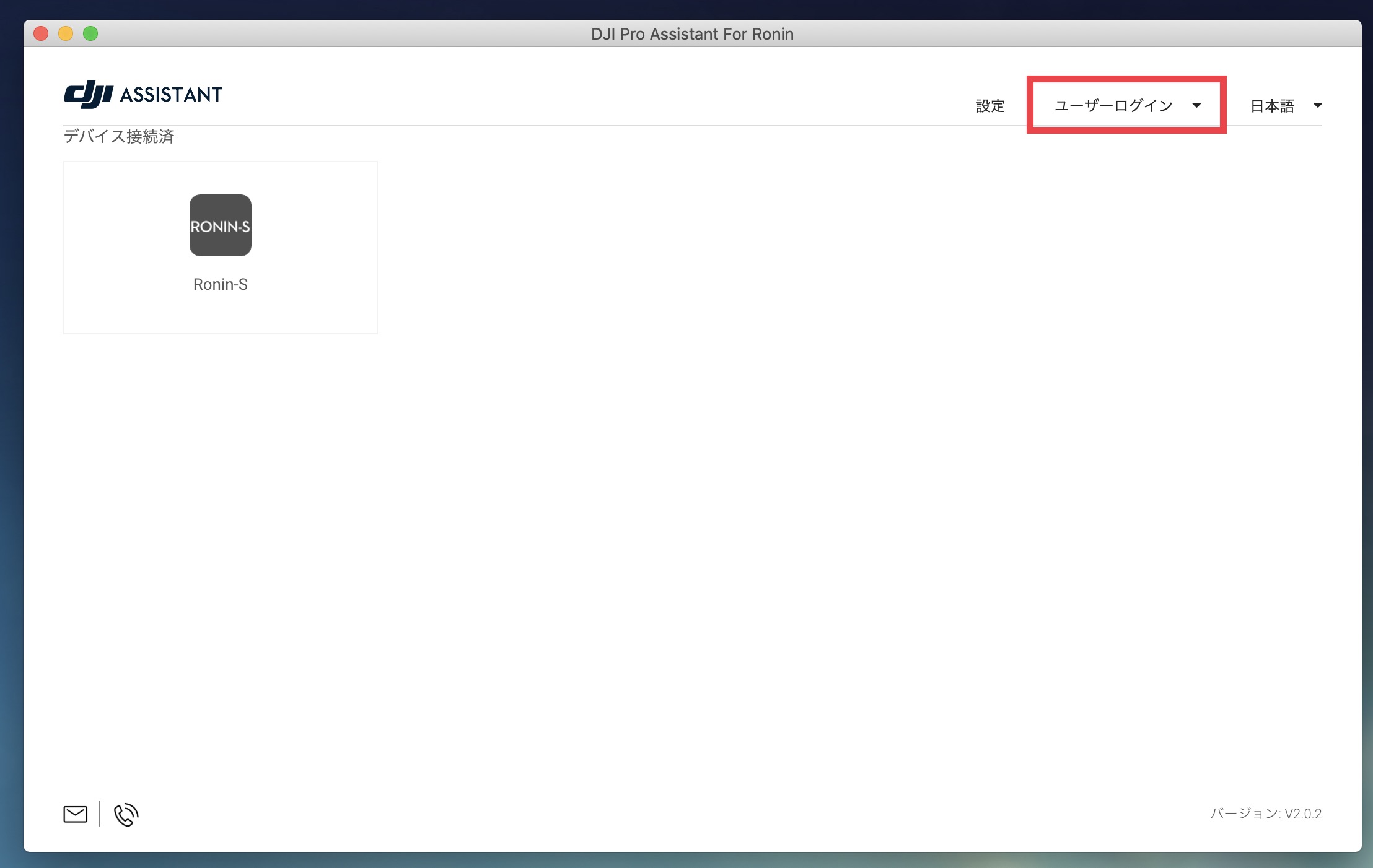 DJIのサイトから「DJI Pro Assistant For Ronin」のアプリをOSに合わせてダウンロードし、インストールを完了させます。