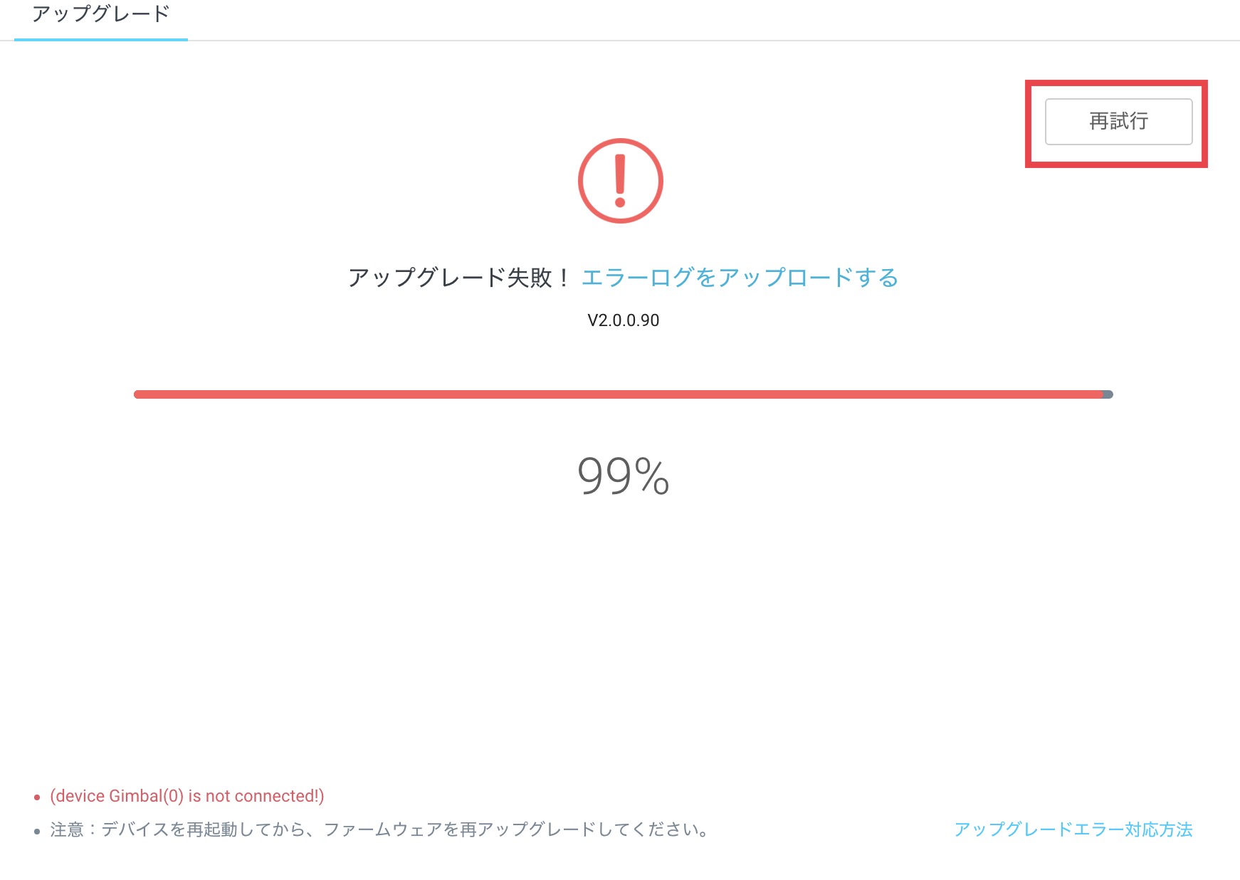 上手くいけば5分程度で完了すると思いますが、下のように失敗した場合はRonin-Sの電源を切って、またオンにした後で右上の「再試行」をクリックします。