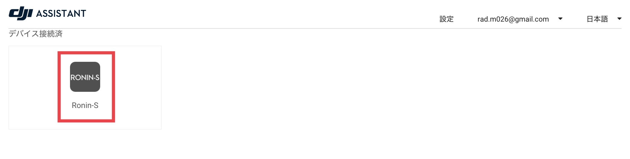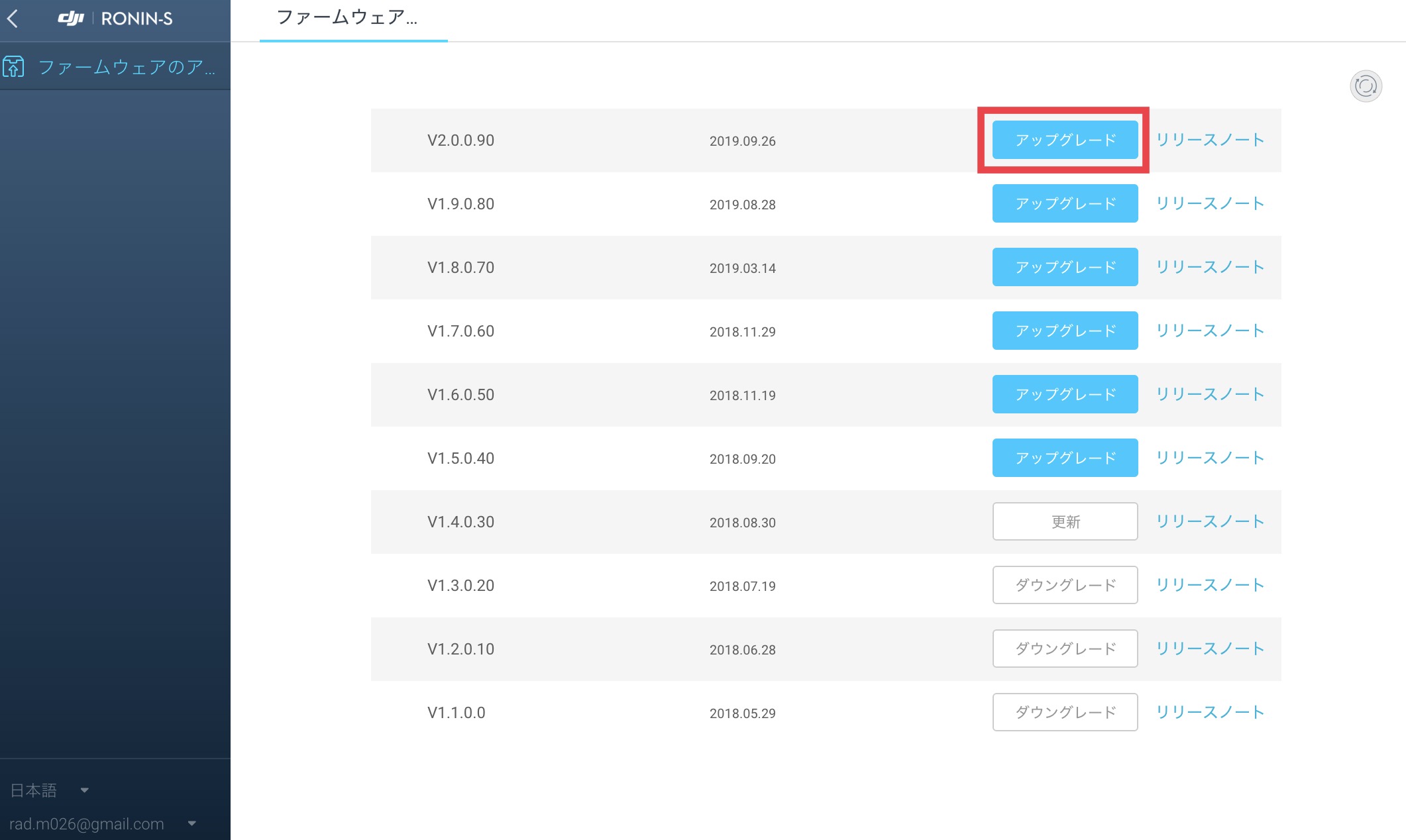 デバイス接続済みの項目から「Ronin-S」を選択し、ファームウェア一覧を表示させます。