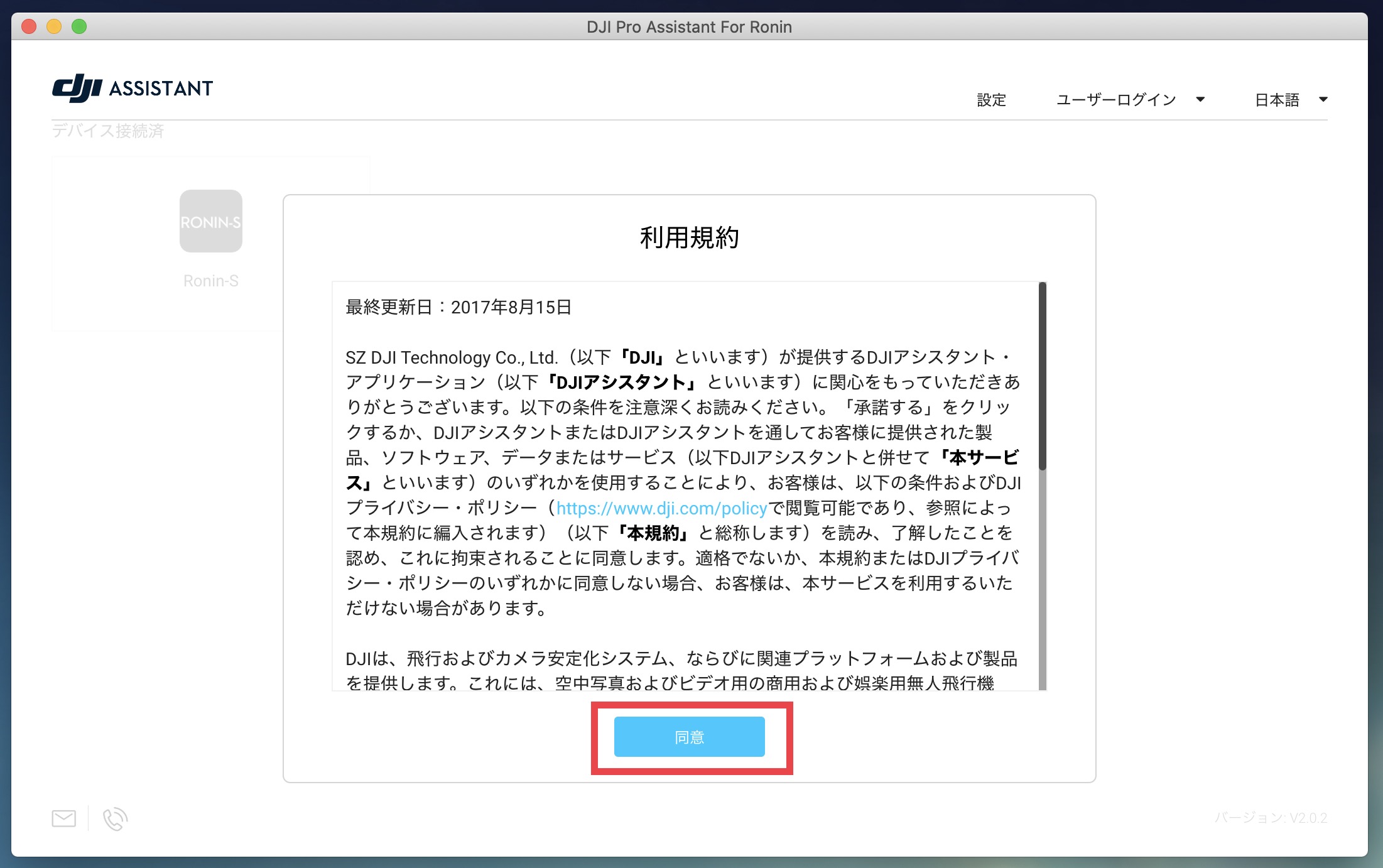 パソコンでDJI Pro Assistantを起動し、利用規約に同意します。