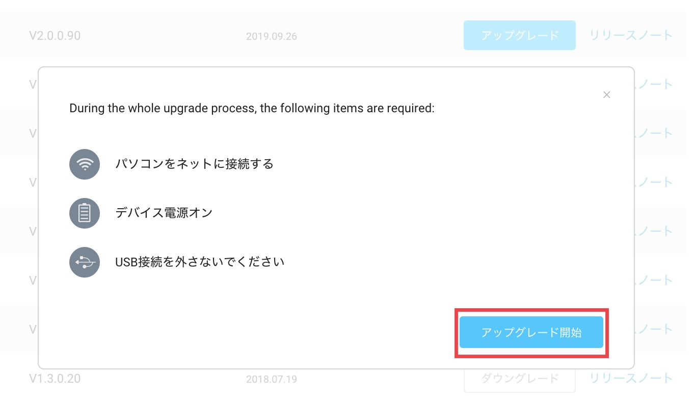 その後で「アップグレードを開始」をクリックし、ファームウェアのダウンロードとインストールが行われるまで、しばらく待ちましょう。