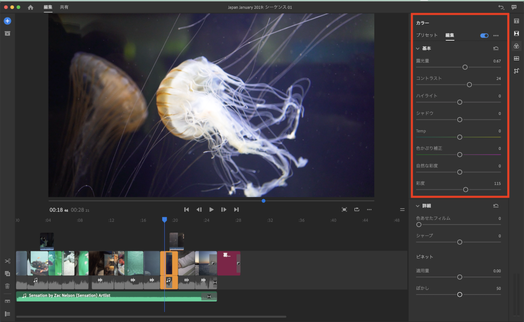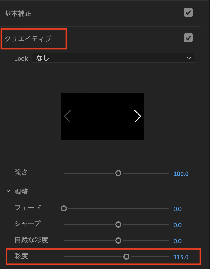 ただ注意しなくては行けないのは露光量などは「基本補正」に入るのに対し、彩度は「クリエイティブ」のタブに表示されるようになっています。そのため、ガッツリと色補正をRushでした方は、Premiere Proのどこで適用されているかも一度確認した方が良いでしょう。