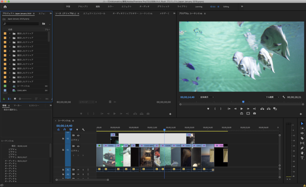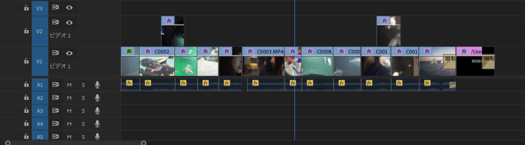 シーケンスにはBGMが一つ、映像の音声はほとんどミュート化にし、一部のクリップはビデオ1(V1)の真上に来るようにしています。